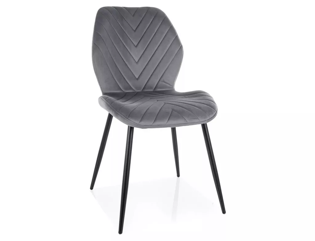 Elegáns, modern étkezőszék szürke bársony kárpitozással és V-alakú steppelt háttámlával, amely tökéletes választás az étkezőbe vagy dolgozószobába.