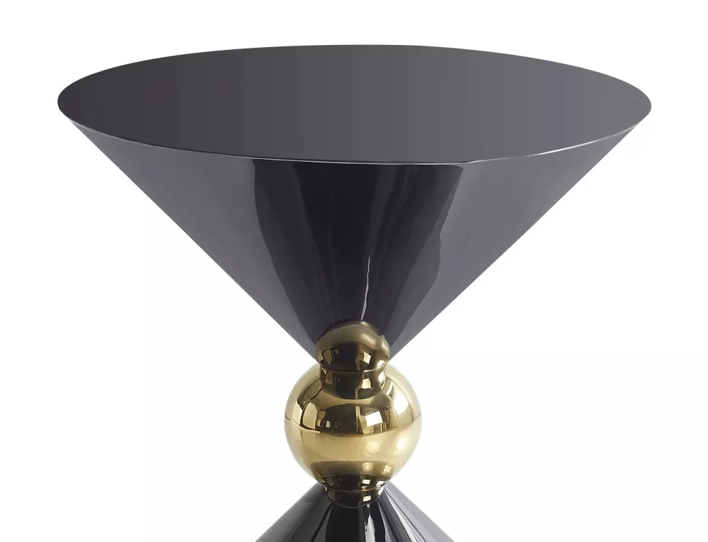 A Mira dohányzóasztal egy művészi alkotás, amely tökéletesen ötvözi a modern formatervezést és a luxus megjelenést. A homokóra forma és a fekete magasfényű felület elegáns kontrasztot alkot az arany színű díszgömbbel, amely a bútor központi eleme.
