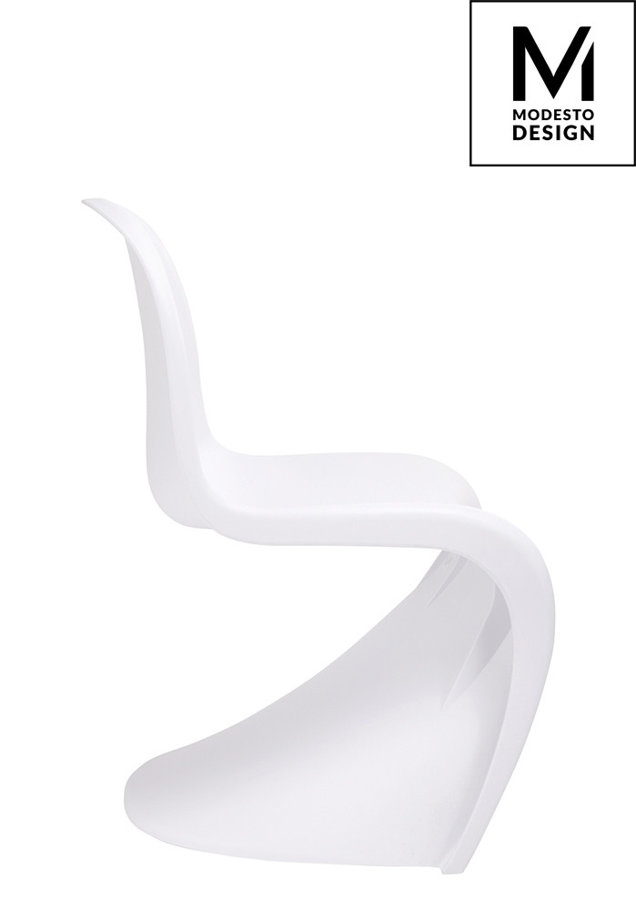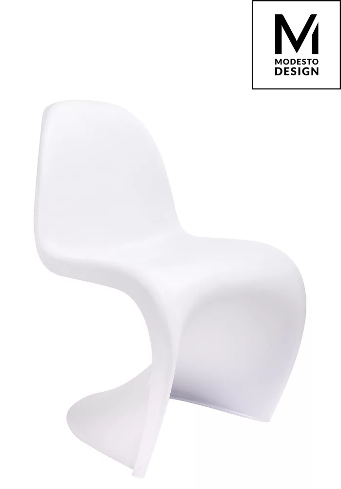 Modern vonalvezetésű, fehér polipropilén szék egyedi S-alakú dizájnnal, amely tökéletes választás a kortárs belső terekbe.