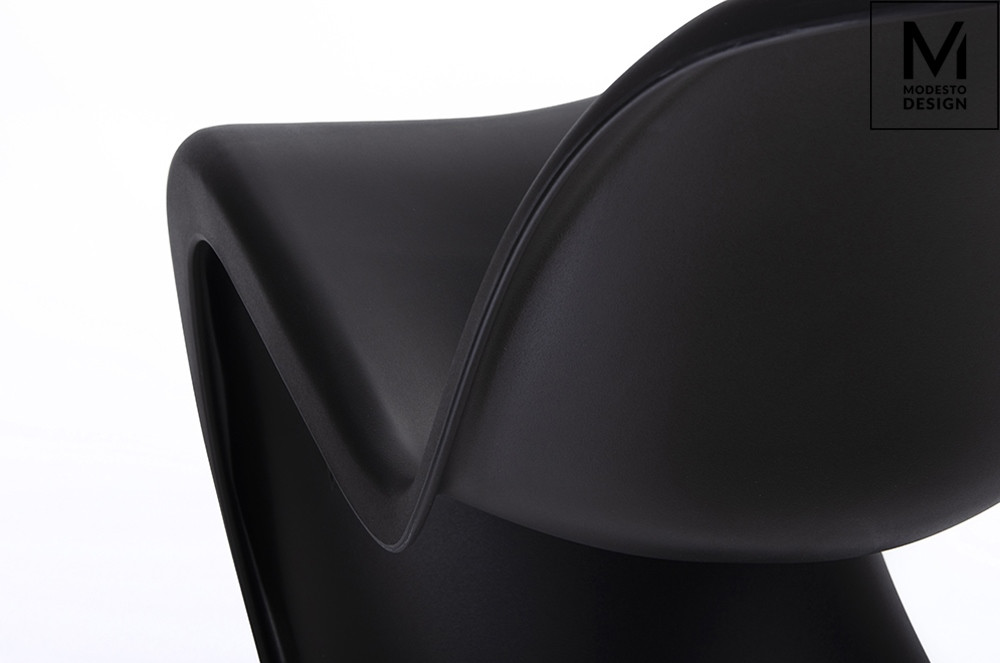 Modern vonalvezetésű, egyedi formájú szék matt fekete polipropilénből, amely tökéletes választás a kortárs enteriőrökbe.