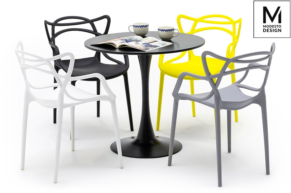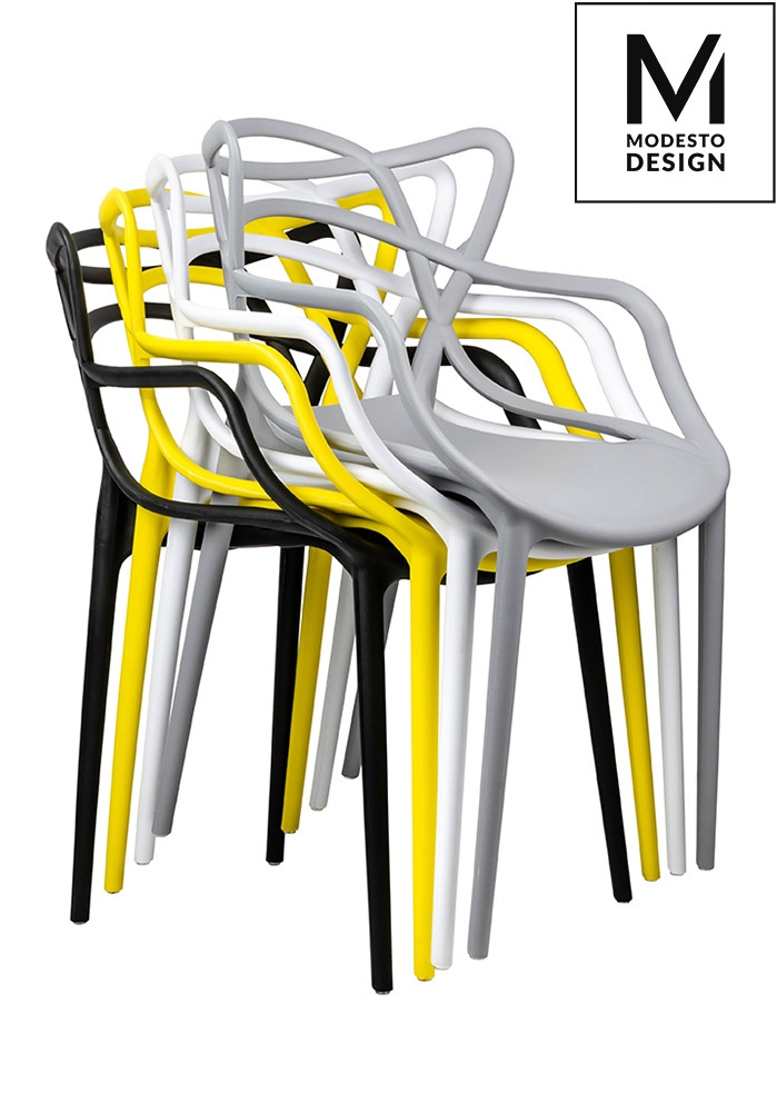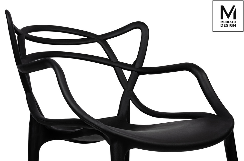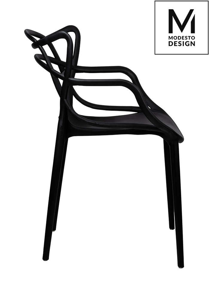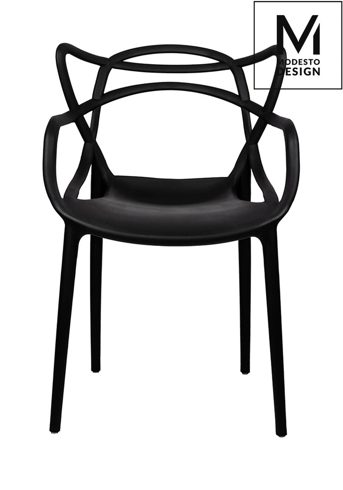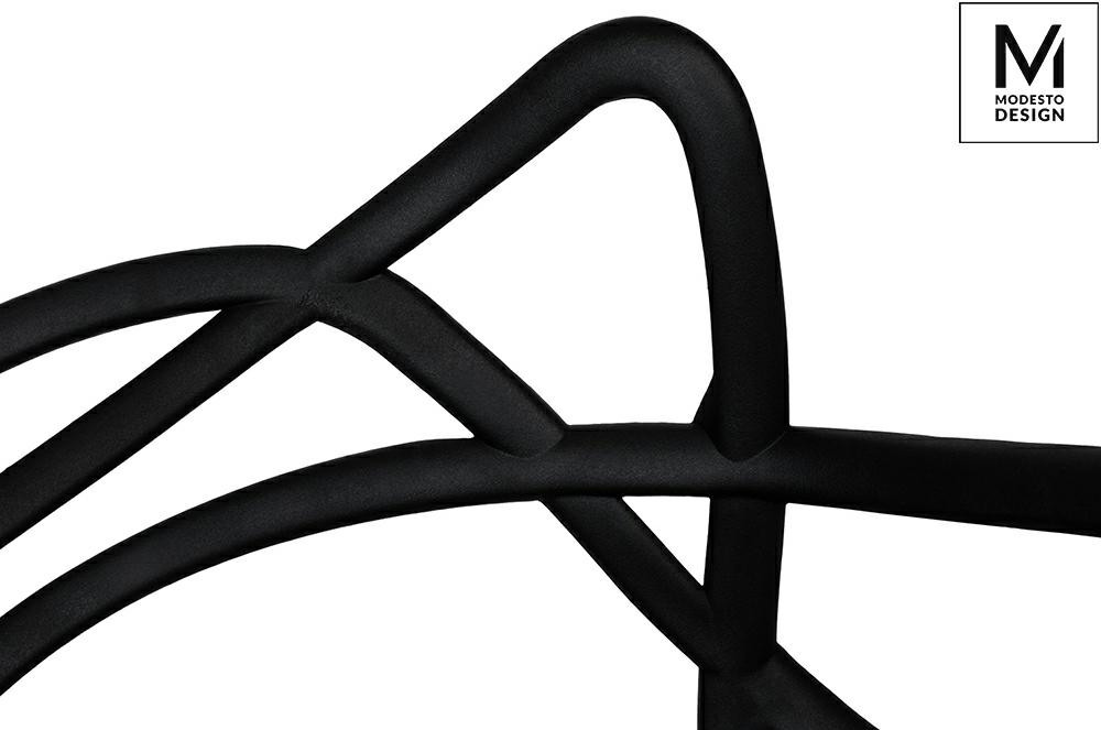 A Modesto HILO szék a modern design és funkcionalitás tökéletes ötvözete. A különleges, fonott mintázatú háttámla nem csupán esztétikai elem, hanem ergonomikus kialakítást is biztosít. A matt fekete szín és a karfák elegáns megjelenést kölcsönöznek a széknek.