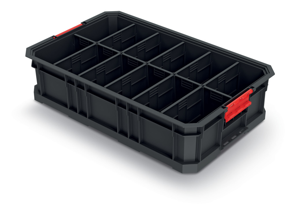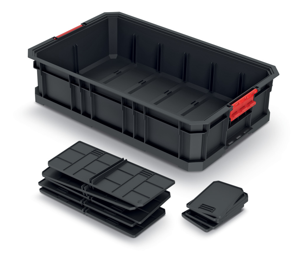 A láda kompatibilis a Modular Solution rendszerrel és a KXBP6045 platformmal, így könnyen integrálható meglévő tárolórendszerekbe. A piros fogantyúk ergonomikus fogást és könnyű hordozhatóságot biztosítanak.
