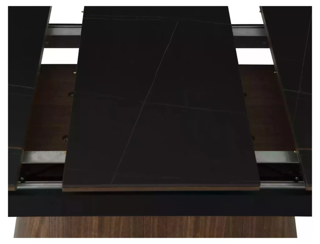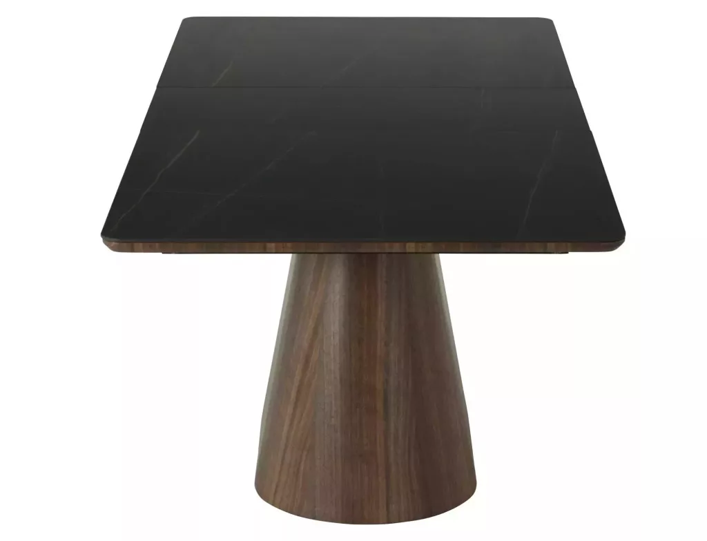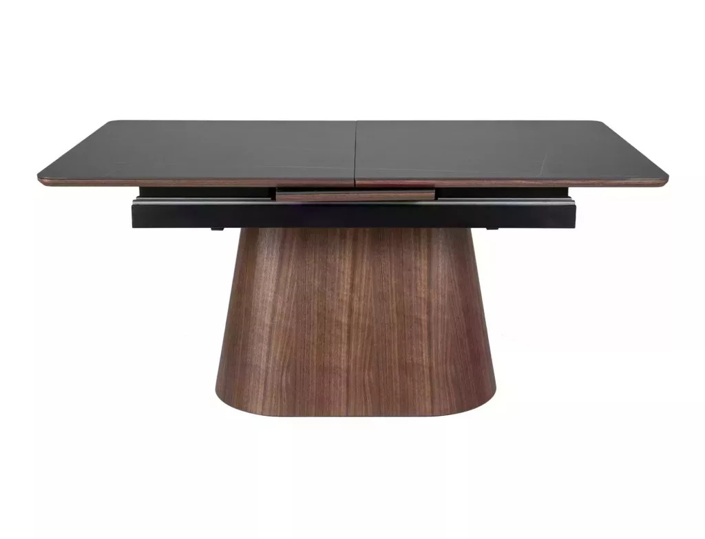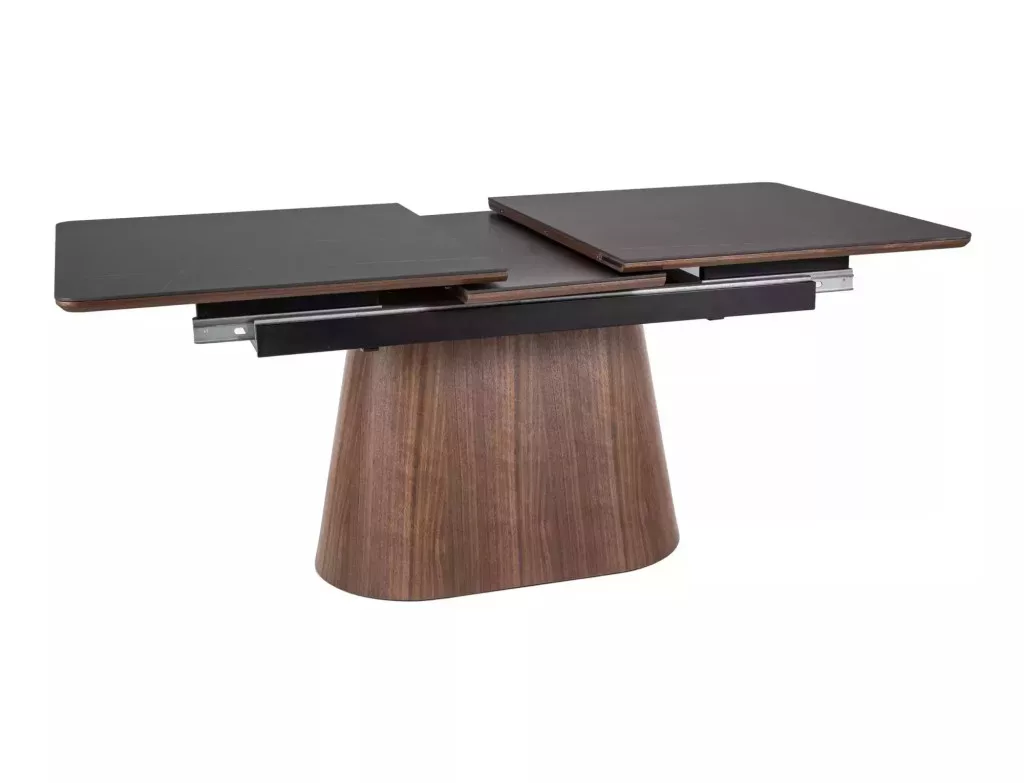 Elegáns, kinyitható étkezőasztal kerámia asztallappal és természetes dió furnérral bevont MDF vázzal, amely tökéletes választás a modern étkező terekbe.