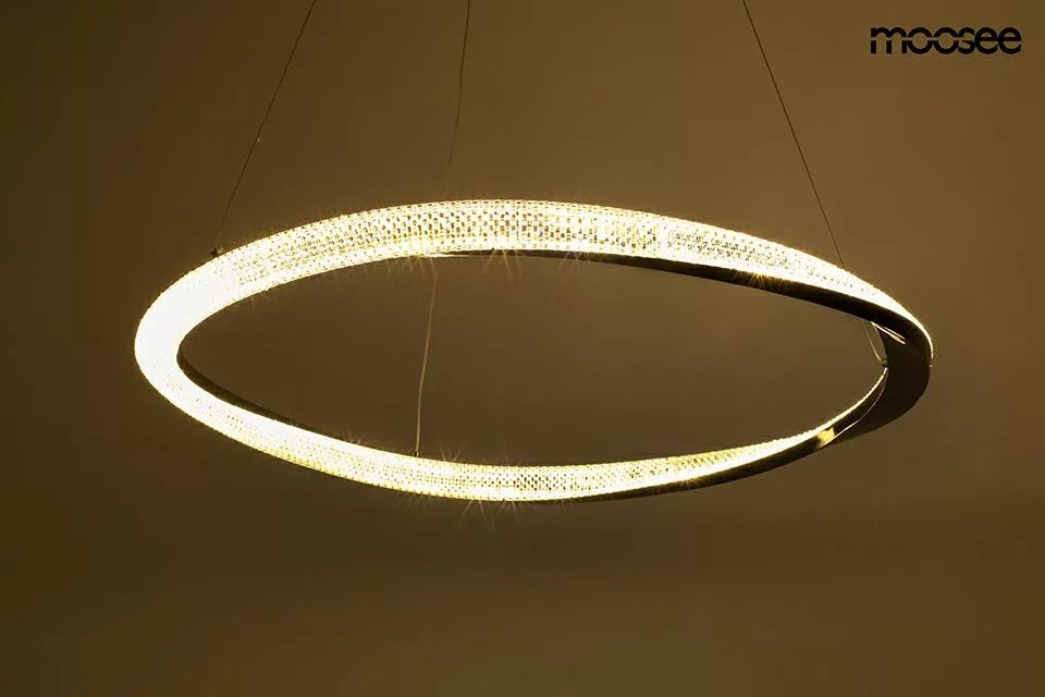 A Moosee Anillo 80 függőlámpa egy lenyűgöző világítási megoldás, amely a modern design és a kiváló funkcionalitás tökéletes szintézise. A 80 cm átmérőjű ovális forma elegáns jelenlétet kölcsönöz bármely térnek, míg a fekete-króm kivitel kifinomult kontrasztot teremt. A lámpatest fém és alumínium konstrukciója nemcsak tartós, hanem vizuálisan is lenyűgöző, különösen a kristályszerű textúrájú felületnek köszönhetően, amely mesés fényjátékot hoz létre.