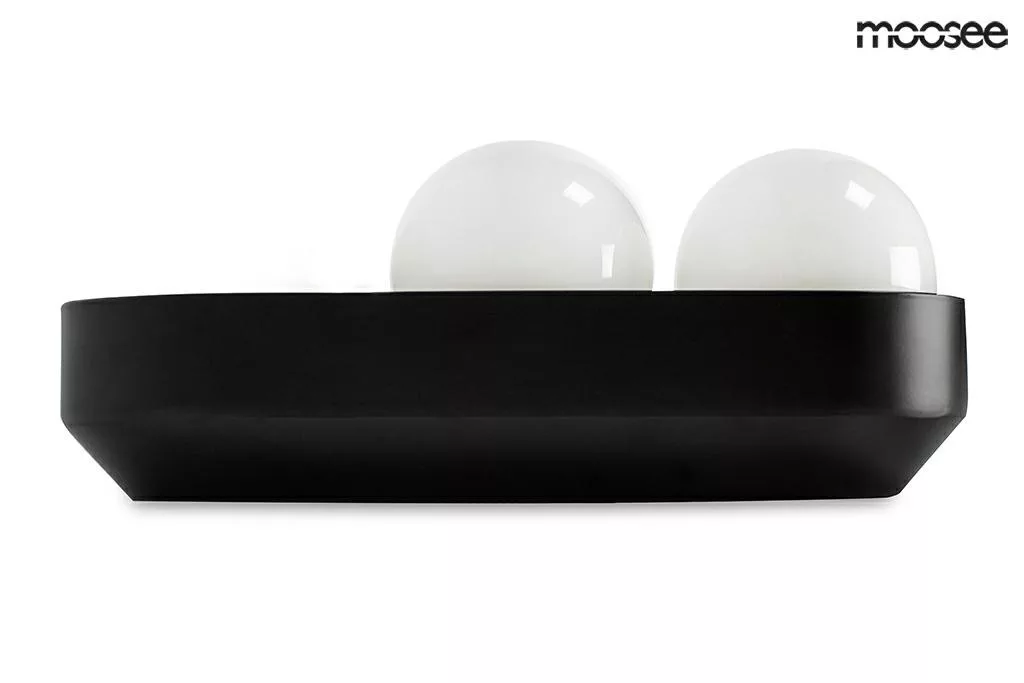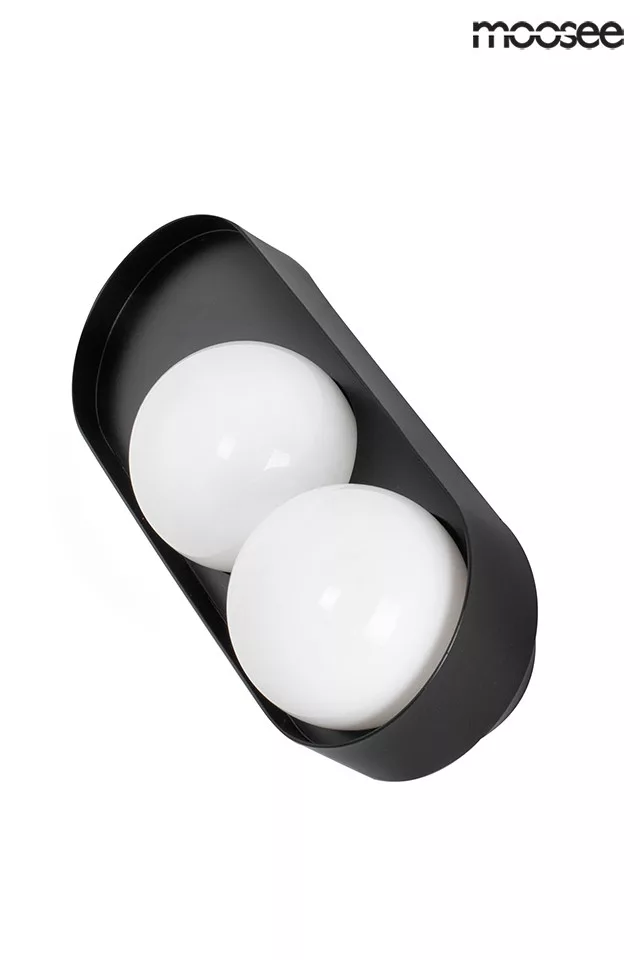 Modern és minimalista fali lámpa két elegáns fehér üveggömbbel és fekete acél kerettel. Tökéletes választás bármely belső tér stílusos megvilágításához.