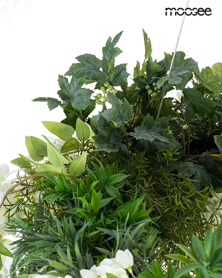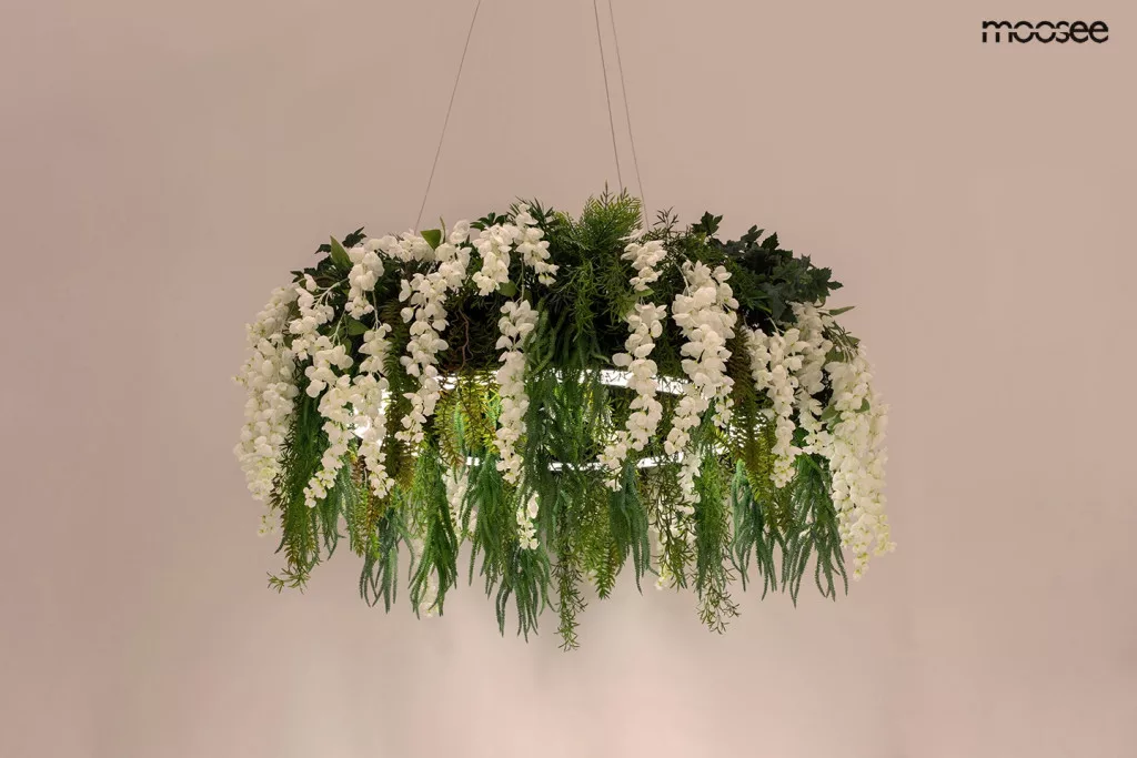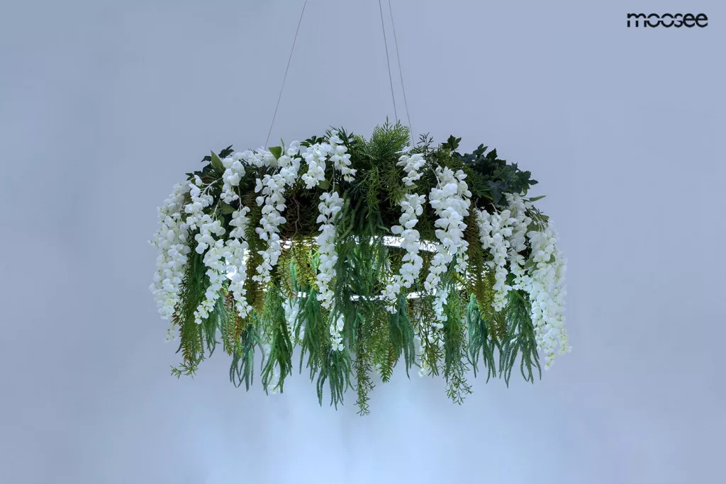 A Moosee Gardens Wisteria 50 függő lámpa lenyűgöző látványt nyújt bármely helyiségben. A 80 cm átmérőjű, fekete gyűrűre erősített művirágok és levelek természetes liánhatást keltenek, mintha egy virágzó glicínia lógna a mennyezetről. A fehér virágfürtök és a buja zöld levelek harmonikus kontrasztja egyedi karaktert kölcsönöz az enteriőrnek, legyen szó nappaliról, étkezőről vagy akár kereskedelmi térről.