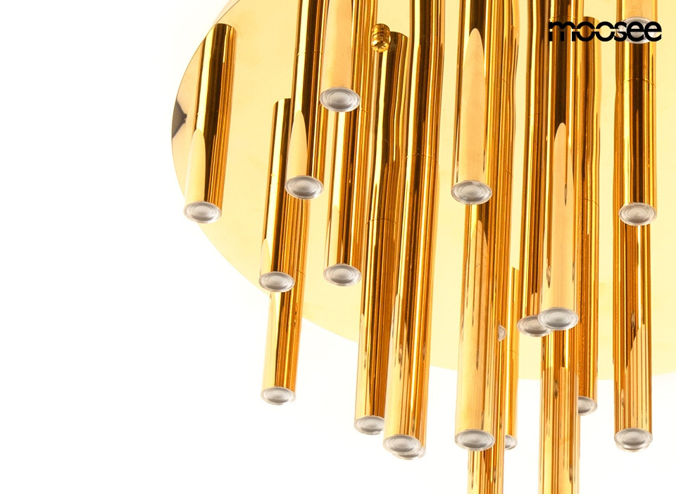 A Moosee Organo 60 mennyezeti lámpa egy igazi ékszerdarab, amely azonnal feldobja bármely helyiség hangulatát. A 33 LED fényforrás egyedi kaskád kompozícióban helyezkedik el, dinamikus és kortárs formát alkotva. Az arany felületű fém csövek lenyűgöző vizuális hatást keltenek, miközben a fény gyönyörűen verődik vissza róluk, varázslatos fényjátékot teremtve.