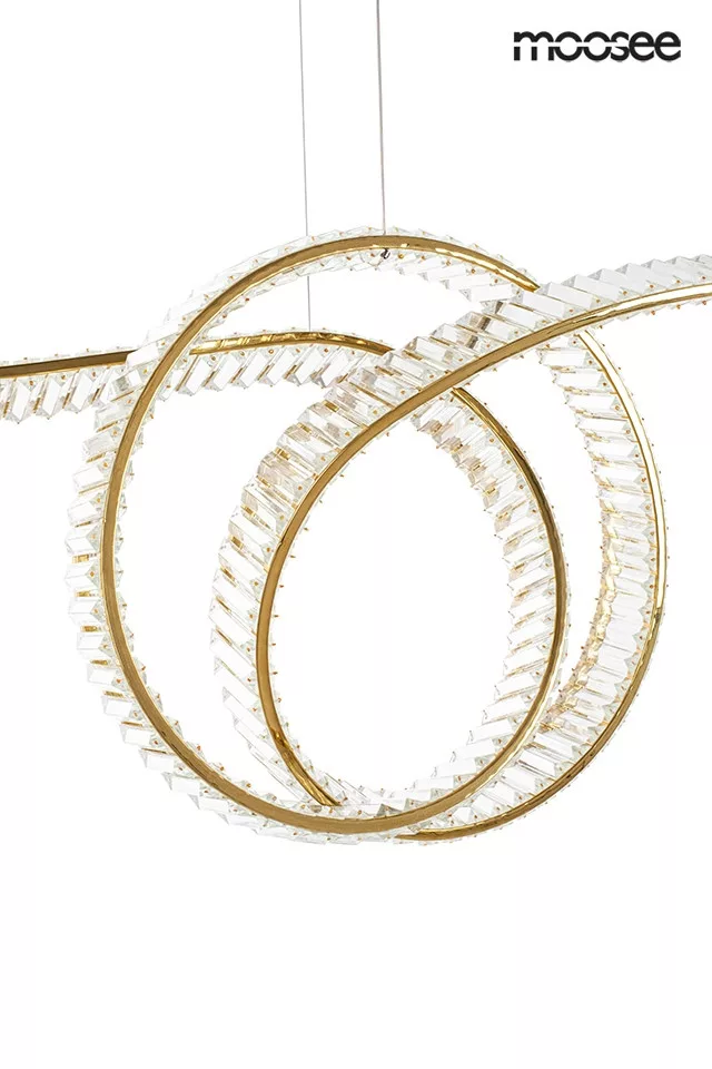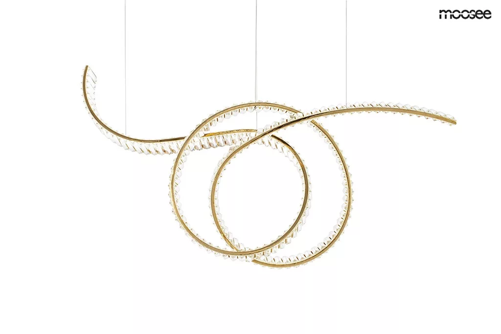A Moosee Wave 120 függőlámpa egy igazi építészeti műalkotás, amely ötvözi a modern formatervezést és a klasszikus eleganciát. A hullámzó, arany színű acélszerkezet és a beépített kristályok harmonikus összhangja különleges fényjátékot hoz létre, ami azonnal a helyiség központi elemévé válik.