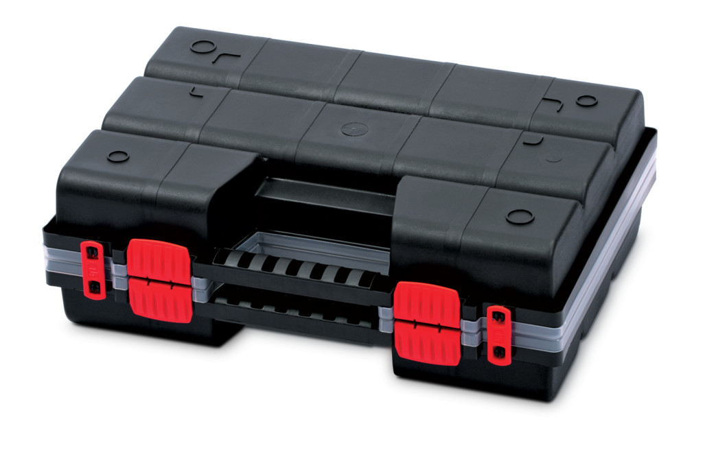 A 20 kivehető rekesz teljesen személyre szabható tárolást tesz lehetővé, az ergonomikus fogantyú pedig kényelmes szállítást biztosít. A megbízható csatok biztonságosan zárnak, megakadályozva a véletlen kinyílást.