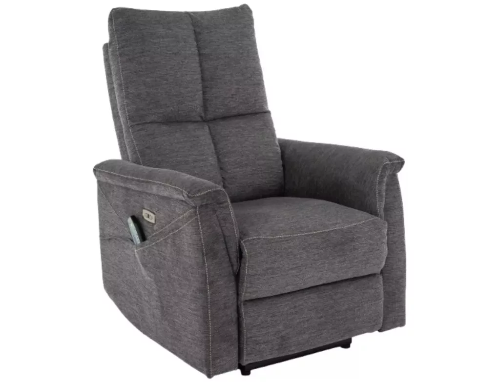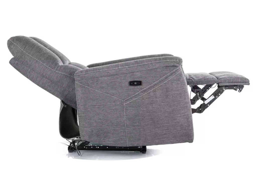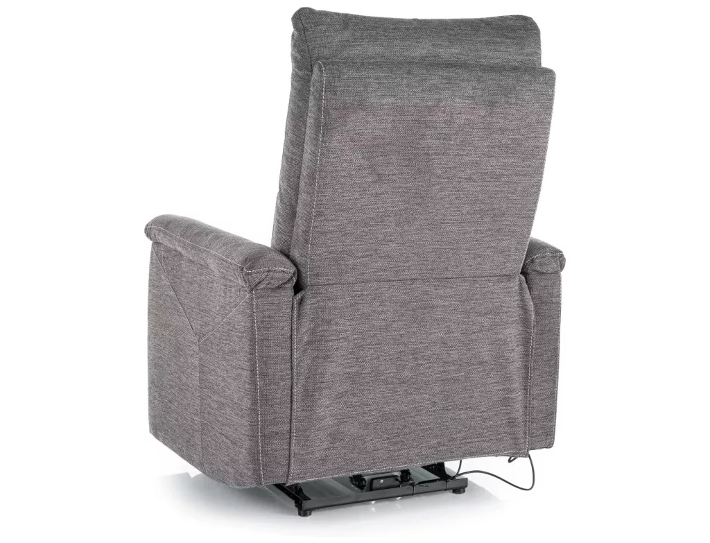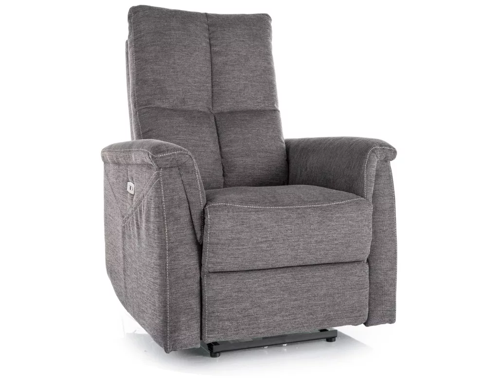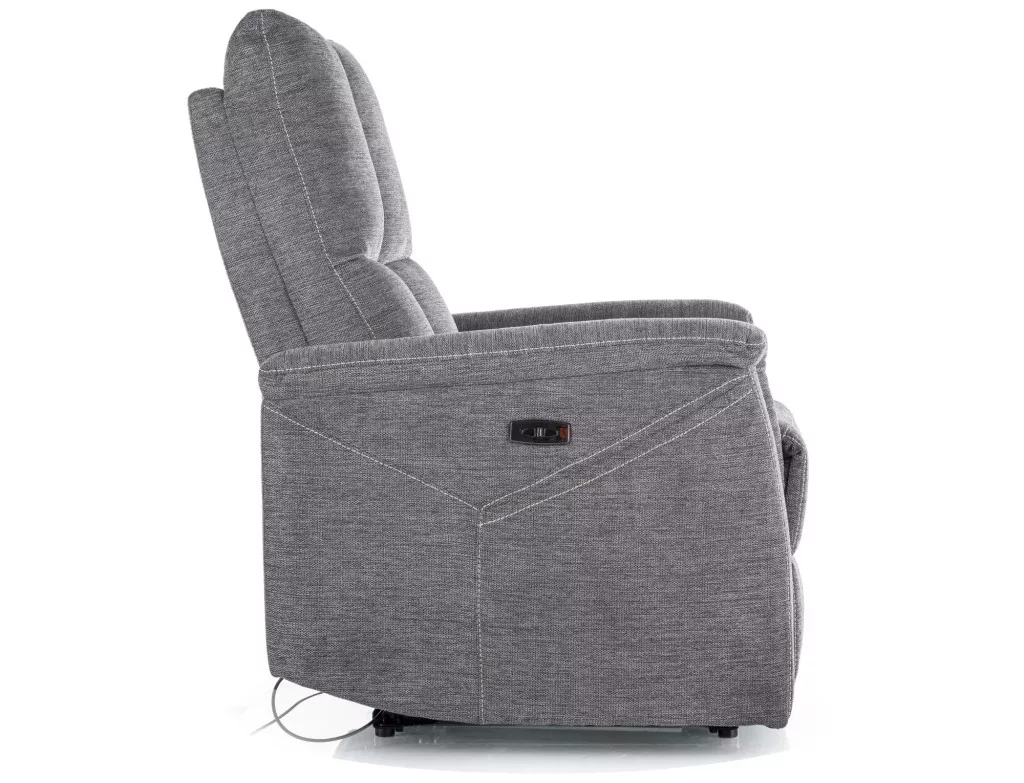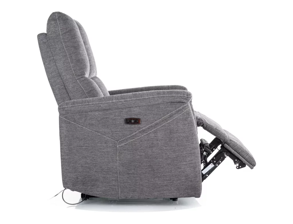 Luxus kényelmet nyújtó elektromos masszázsfotel beépített USB porttal, fűtés funkcióval és vezetékes távirányítóval. Stílusos sötétszürke Brego szövet kárpitozással és fekete fém vázzal.