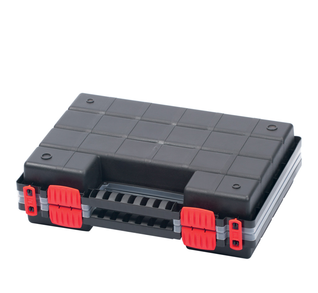 Professzionális dupla szerszámrendező 36 kivehető tárolórekesszel, átlátszó fedéllel és ergonomikus fogantyúval a maximális rendszerezhetőségért.