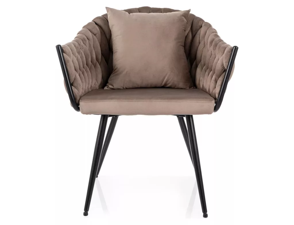 A matt fekete fémlábak stabil alapot nyújtanak, miközben légies megjelenést kölcsönöznek a széknek. A szék tartozéka egy harmonizáló díszpárna, amely tovább fokozza a kényelmet és az esztétikai élményt.