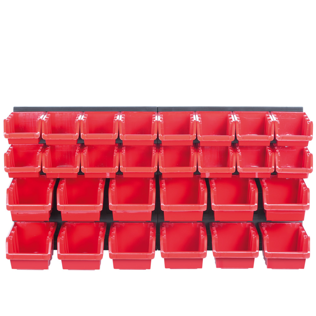 Professzionális műhelyfelszerelés 28 tárolórekesszel, amely tökéletes megoldást nyújt szerszámok és alkatrészek rendszerezett tárolására.