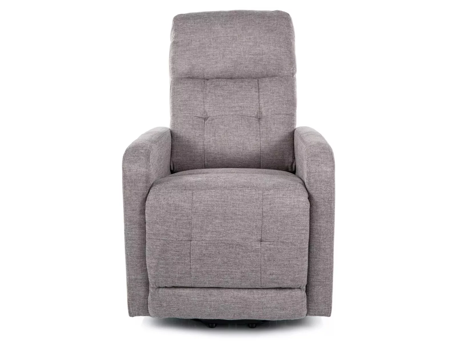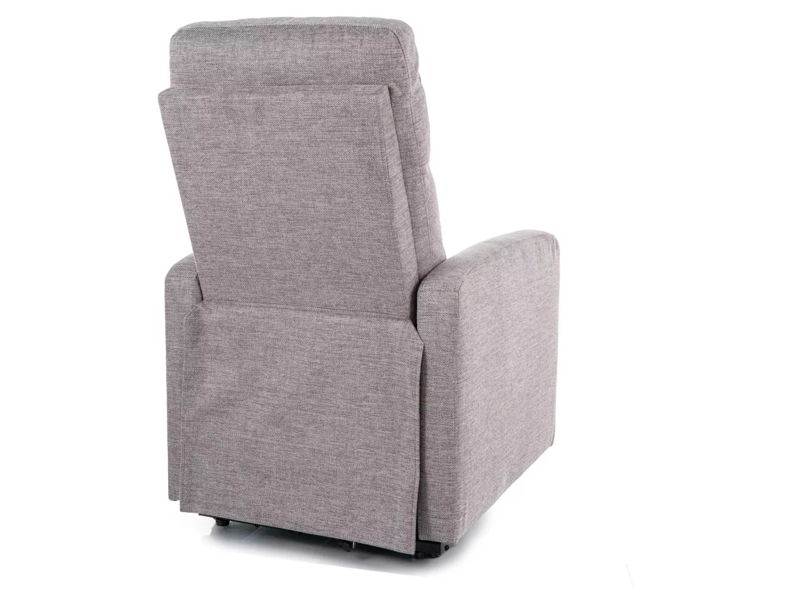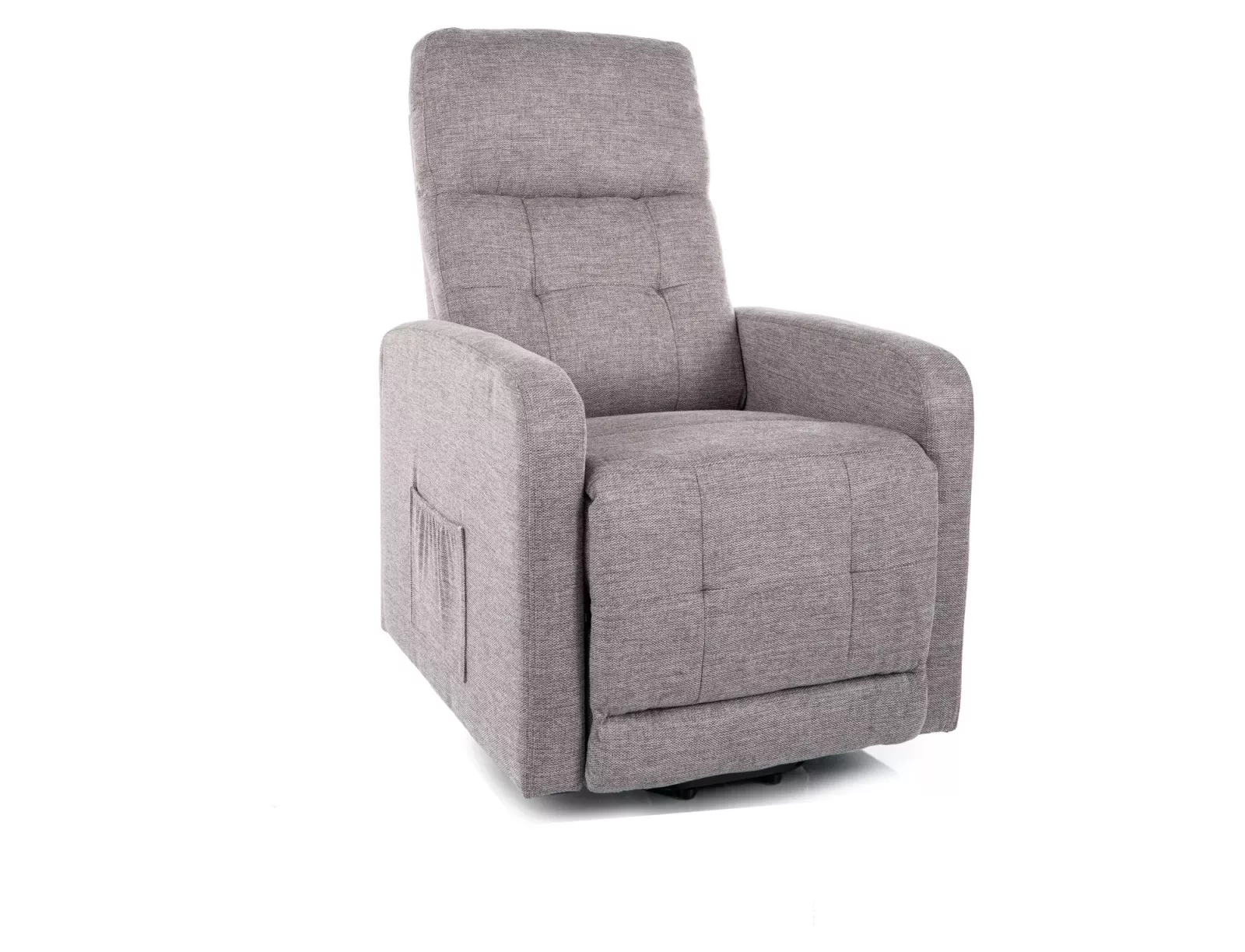 Kényelmes, elektromosan állítható relax fotel szürke Brego szövettel és fekete fém vázzal, praktikus oldalsó tárolózsebekkel.