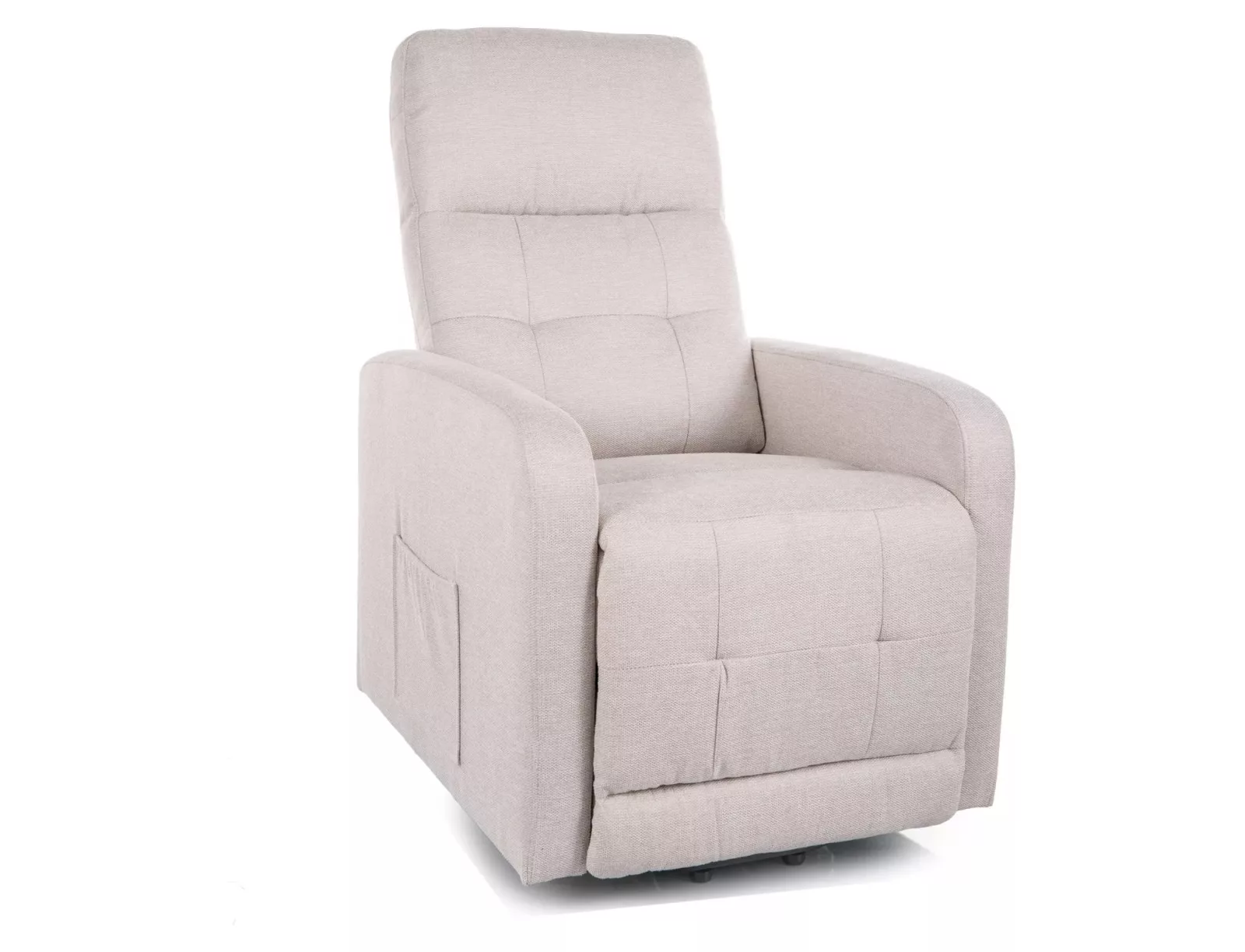 A világos bézs Brego szövet kárpitozás és a fekete fém váz elegáns megjelenést kölcsönöz a fotelnek. Az oldalsó tárolózseb praktikus megoldást kínál a távvezérlő és egyéb kisebb tárgyak tárolására.