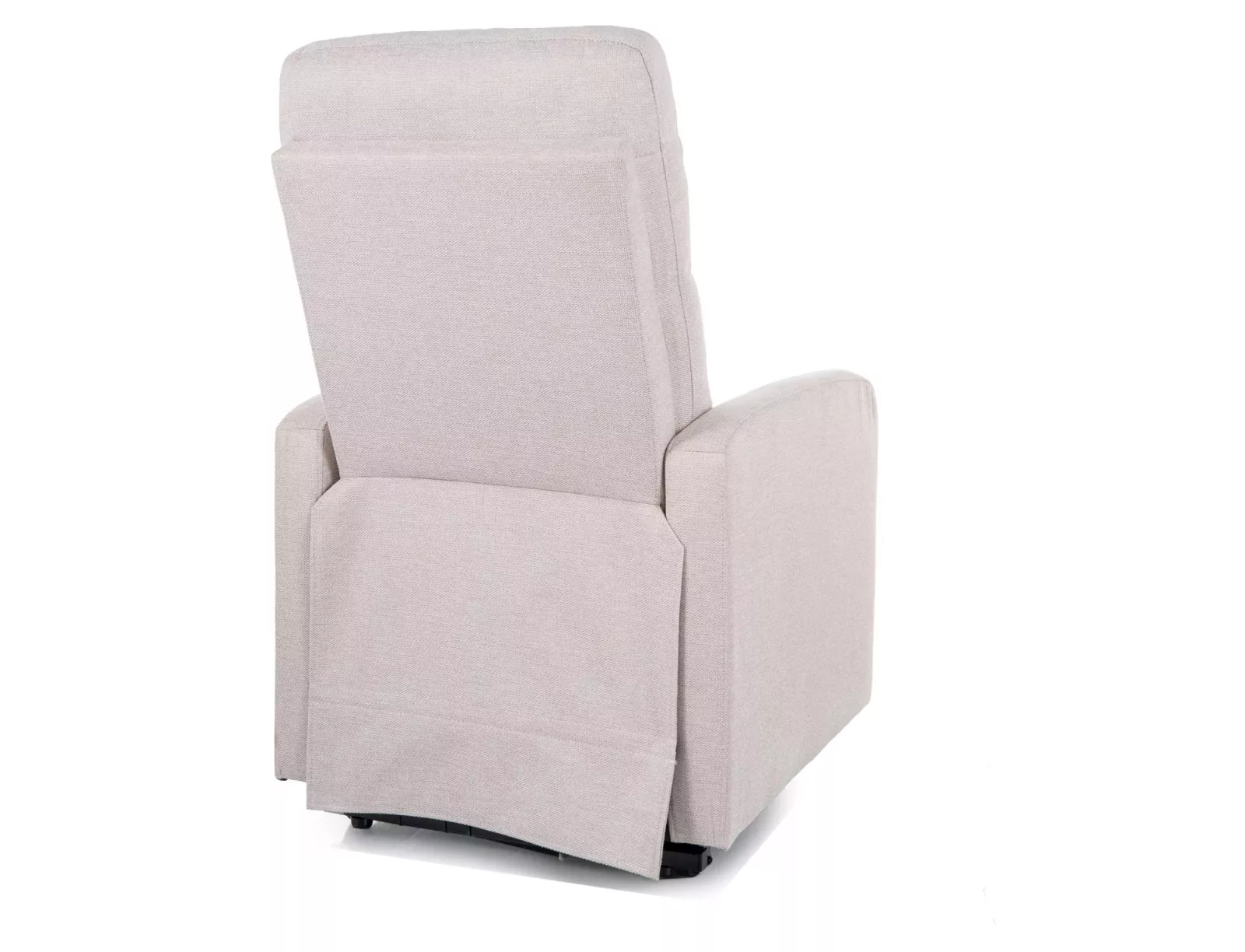 Kényelmes, elektromosan állítható relax fotel világos bézs Brego szövettel és fekete fém vázzal, praktikus oldalsó tárolóval.