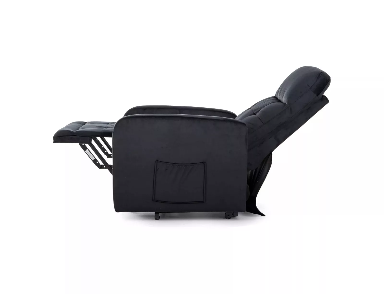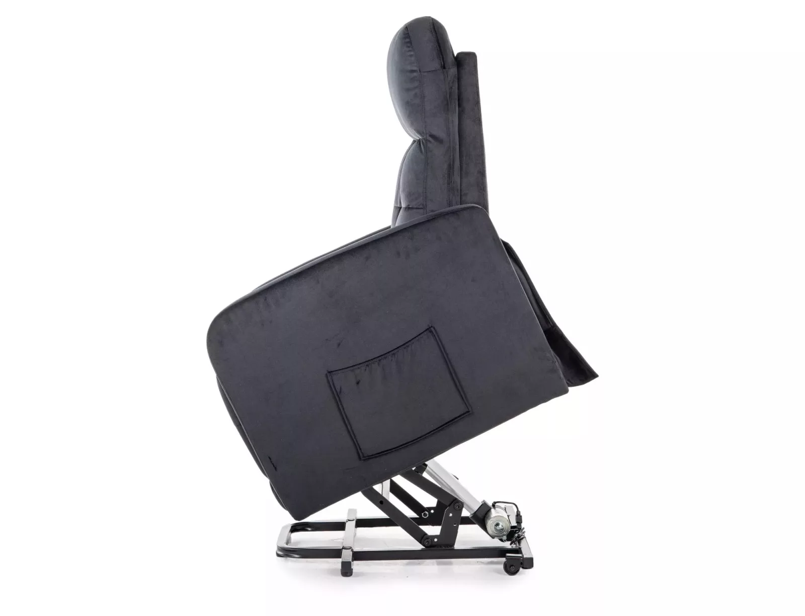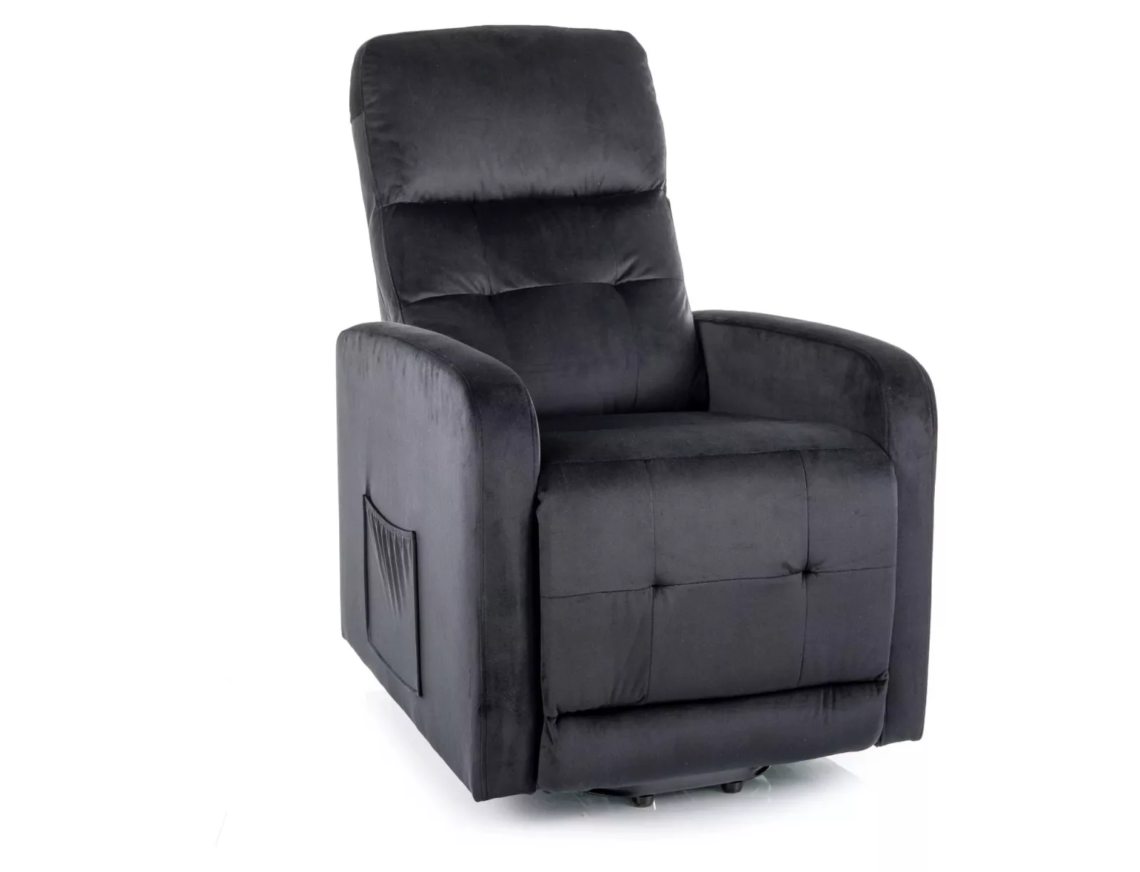 Luxus kényelmet nyújtó elektromos relax fotel fekete bársony kárpitozással és praktikus oldaltárolóval.