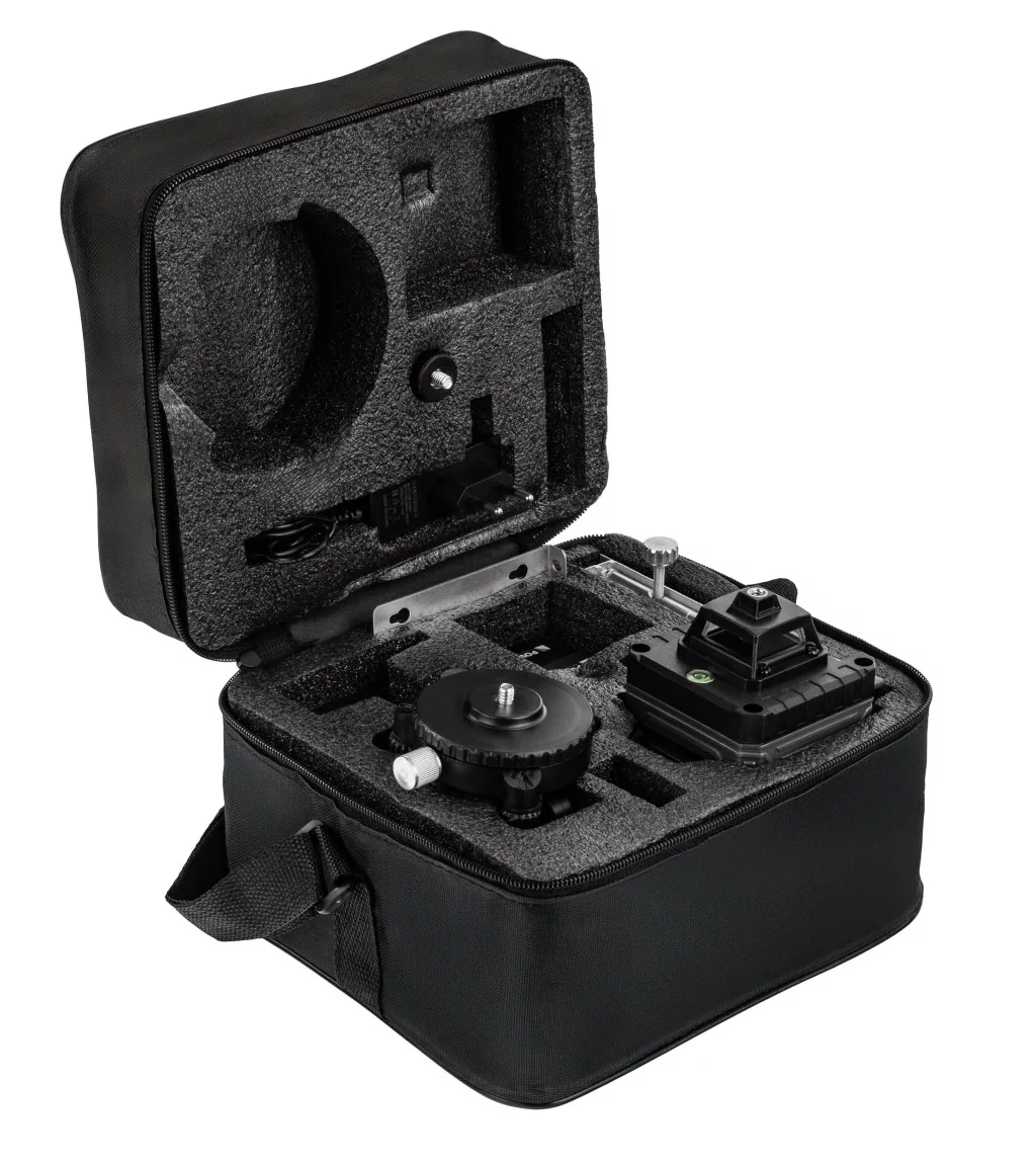 Csomag tartalmalézeres szintező, 2 db akkumulátor, töltő, kerek platform, szögletes platform, fali sín, távirányító, hordtáska, állvány adapter, állvány