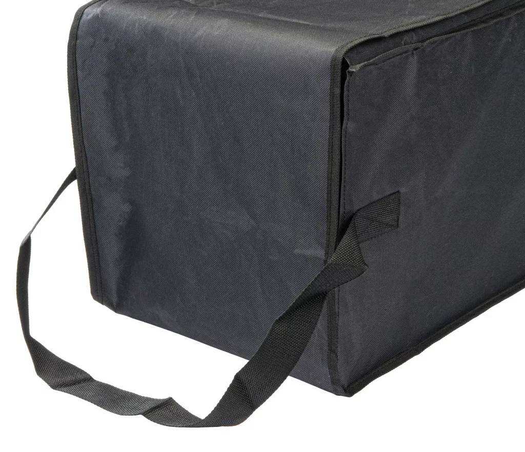 A táska anyaga kiváló minőségű, vízálló polipropilén szövet, amely nemcsak a nedvességet tartja távol, hanem rendkívül ellenálló a mechanikai sérülésekkel szemben is. A robusztus kialakítás biztosítja, hogy a rámpák élesebb szélei se tegyenek kárt a huzatban a tárolás során. A sötét színválasztás praktikus, hiszen a használat során elkerülhetetlen szennyeződések kevésbé látszanak meg rajta.