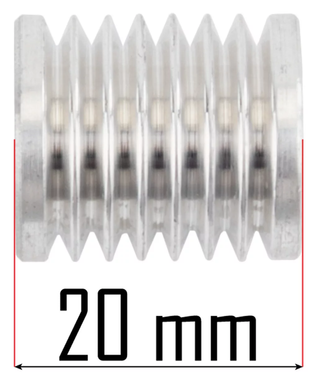 A tárcsa 7 speciálisan kialakított bordával rendelkezik, amelyek maximális tapadást biztosítanak a hosszbordás szíjnak. Ez a kialakítás garantálja, hogy a motor teljesítménye veszteség nélkül jusson el a késig, még sűrűbb vagy nedvesebb fű nyírásakor is. A 17,3 mm-es szélesség és a 20 mm-es hosszúság optimális egyensúlyt teremt a tartósság és a kompakt méret között.