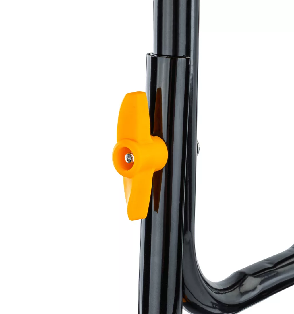 A tárolás és szállítás sem okozhat gondot. A vázszerkezet szárnyas anyákkal van rögzítve, így a gép szerszámok nélkül, pillanatok alatt szét- és összeszerelhető. Ez a praktikus megoldás lehetővé teszi, hogy a szezon végén a kapálógép minimális helyet foglaljon a garázsban vagy a kerti tárolóban. A hálózati kábel számára kialakított speciális akasztó pedig megakadályozza a vezeték összegabalyodását munka közben.