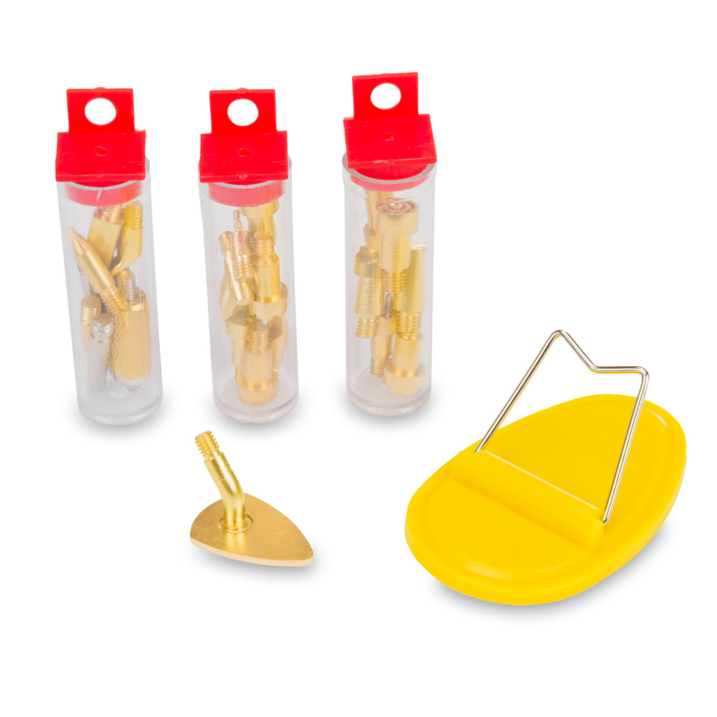 A csomagban található 22 darab különböző kialakítású sárgaréz hegy (grot) rendkívüli rugalmasságot biztosít. A készlet tartalmaz különböző mintázatú pecséteket, vékony rajzolóhegyeket és egy speciális forró kést is, amellyel számos anyagot könnyedén vághat. A sárgaréz alapanyag kiváló hővezető képességgel rendelkezik, így a hőveszteség minimális, a munka pedig hatékonyabb.