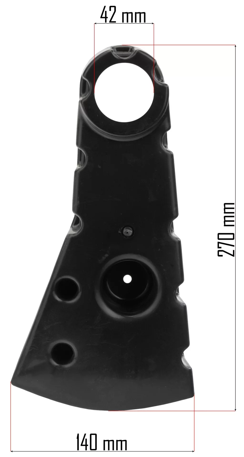 A burkolat kiváló minőségű, ütésálló műanyagból készült, amely ellenáll a kerti munkák során fellépő fizikai behatásoknak és a változó környezeti tényezőknek. A 270 mm-es hosszúság és a 140 mm-es szélesség optimális lefedettséget biztosít a kritikus pontokon, megóvva a belső alkatrészeket. A 42 mm-es furatátmérő lehetővé teszi a stabil és rezgésmentes rögzítést a fűnyíró vázán.