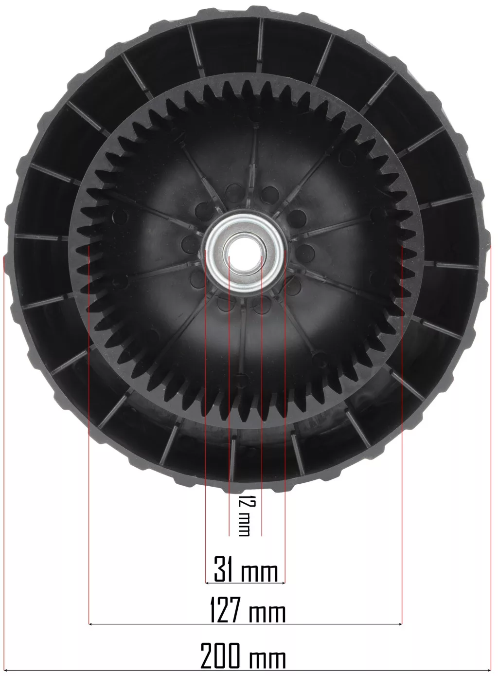 A kerék 200 mm-es külső átmérővel és 47 mm-es futófelület-szélességgel rendelkezik, ami stabil úttartást és kiváló tapadást biztosít még nedvesebb fűben is. A belső oldalon található 52 fogas fogaskoszorú precízen illeszkedik a fűnyíró hajtóművéhez, így garantálva a zökkenőmentes és hatékony erőátvitelt. A központi furat 12 mm-es átmérője és a csapágyazott kialakítás könnyed gördülést tesz lehetővé.