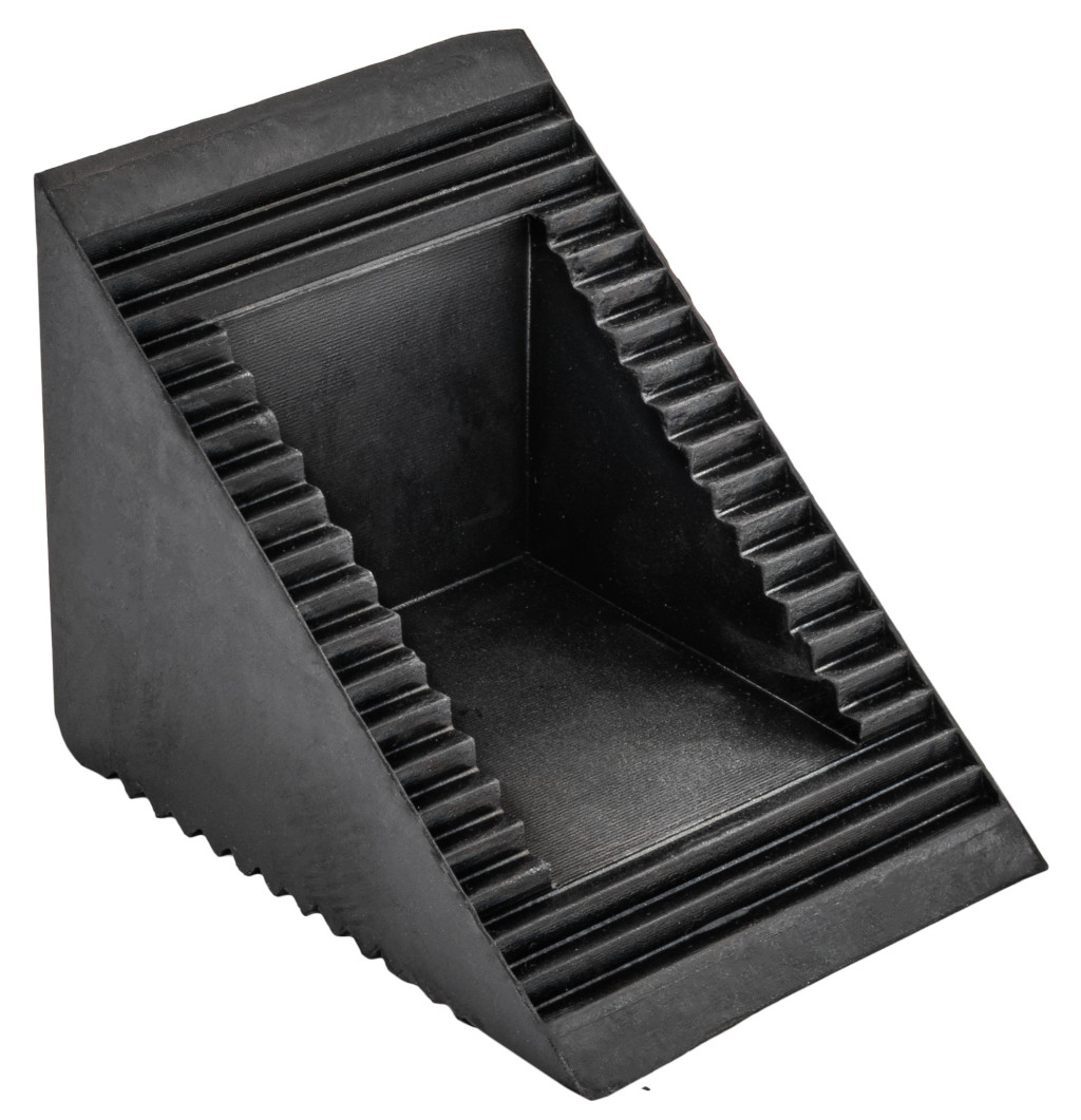 A kerékékek kialakítása a maximális tapadást szolgálja. Az ék felületén és az alján található speciális bordázat és fogazat mélyen belekapaszkodik mind az abroncsba, mind az útfelületbe. Ez a kettős védelem garantálja, hogy a jármű még enyhén lejtős terepen vagy csúszósabb aljzaton is mozdulatlan maradjon, jelentősen növelve a munkavégzés biztonságát.