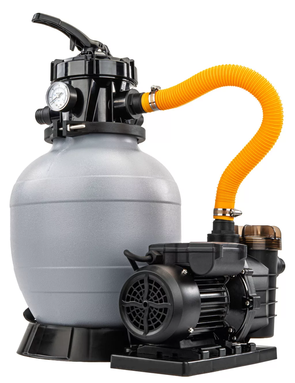 Nagy teljesítményű homokszűrős szivattyú 13 200 l/h vízszállítási kapacitással, amely kristálytiszta vizet biztosít közepes és nagy kerti medencék számára.