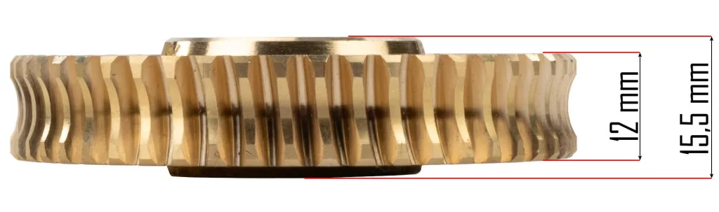 A fogaskerék kiváló minőségű bronz ötvözetből készült, amely kiemelkedő kopásállósággal rendelkezik. Ez az anyagválasztás kritikus a hajtóművek esetében, mivel a bronz kiválóan ellenáll a súrlódás okozta hőnek és mechanikai terhelésnek, jelentősen meghosszabbítva a berendezés élettartamát a hagyományos műanyag vagy gyengébb fém alkatrészekkel szemben.