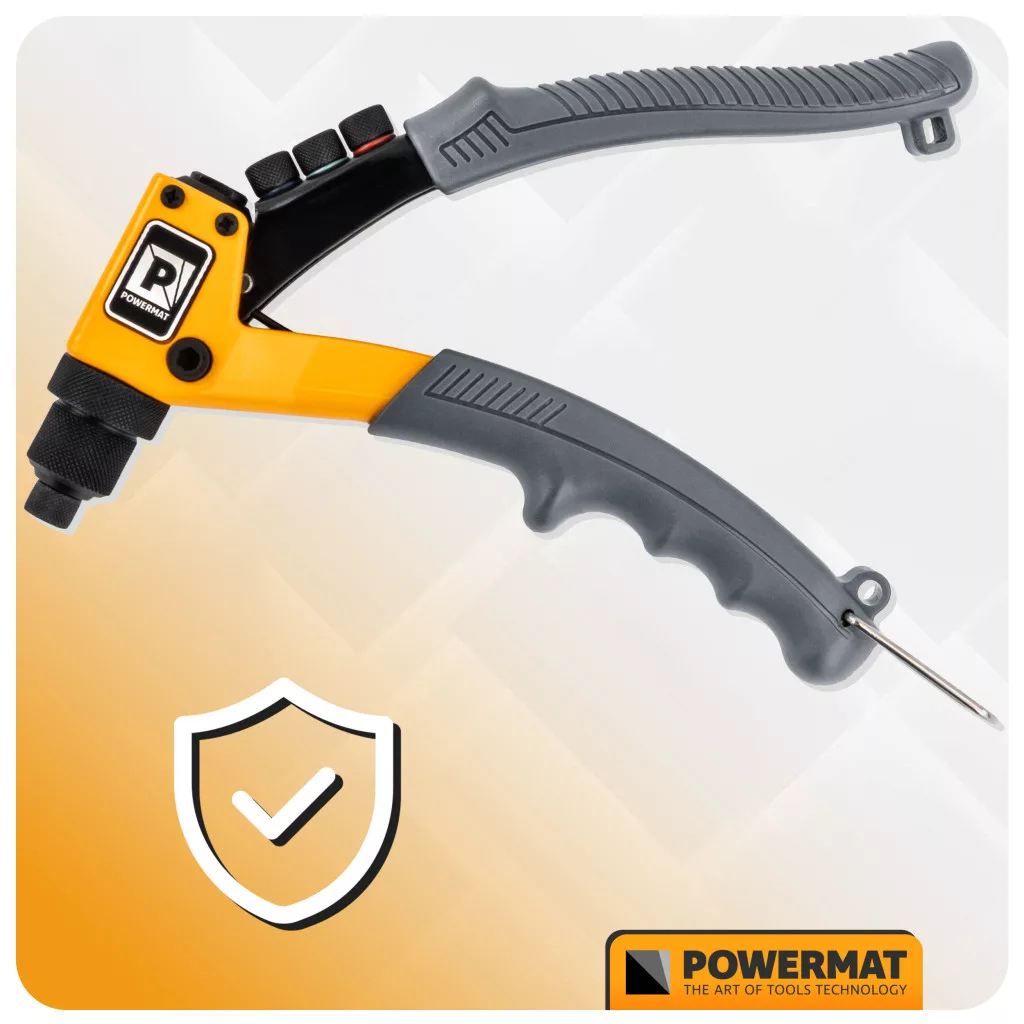 A szerszám használata egyszerű és intuitív: a szegecs behelyezése után a karok összezárásával a mechanizmus behúzza a tüskét, majd a megfelelő szorítóerő elérésekor szabályozottan letöri azt. Az eredmény egy tiszta, esztétikus és rendkívül tartós kötés, amely kiválóan ellenáll a rázkódásnak és a mechanikai igénybevételnek. Válassza a Powermat minőséget a hatékony és gyors munkavégzéshez!