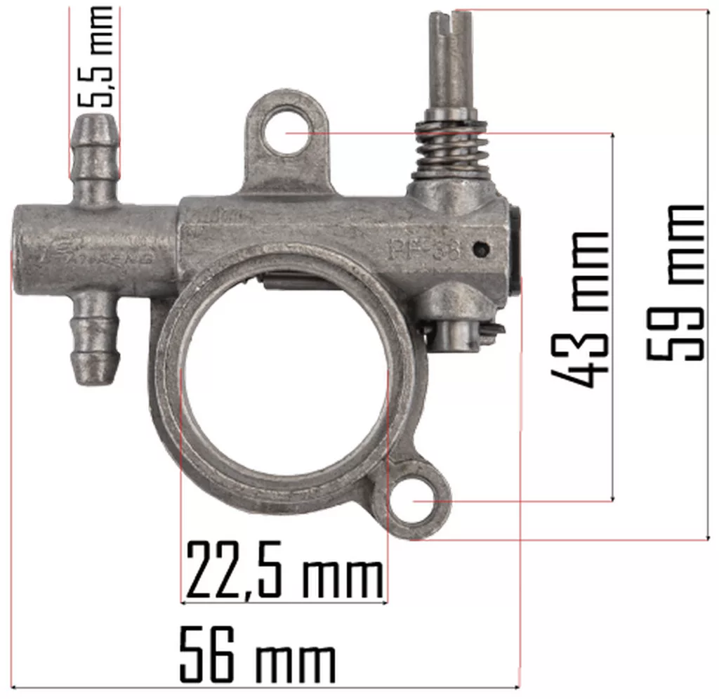 A szivattyú robusztus fémötvözetből készült, amely ellenáll a láncfűrészek működése során fellépő magas hőmérsékletnek és rezgéseknek. A PF-38-as jelöléssel ellátott egység kompakt kialakítása lehetővé teszi a viszonylag egyszerű beépítést, így Ön gyorsan visszatérhet a kerti vagy erdészeti munkálatokhoz. A pontos méretezés (59 mm hosszúság és 56 mm szélesség) garantálja, hogy a beszerelés során nem adódnak illeszkedési problémák.