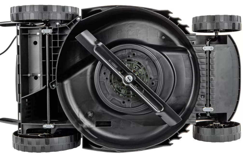 Nagy teljesítményű, 2600 W-os elektromos fűnyíró 38 cm-es munkaszélességgel és 5 fokozatú központi magasságállítással a tökéletes pázsitért.