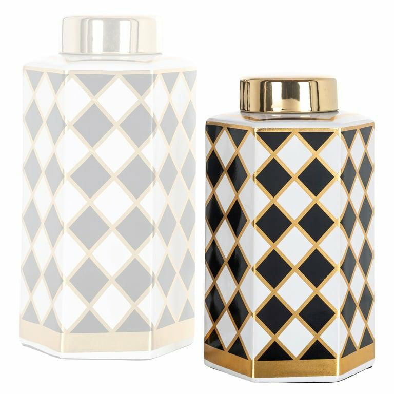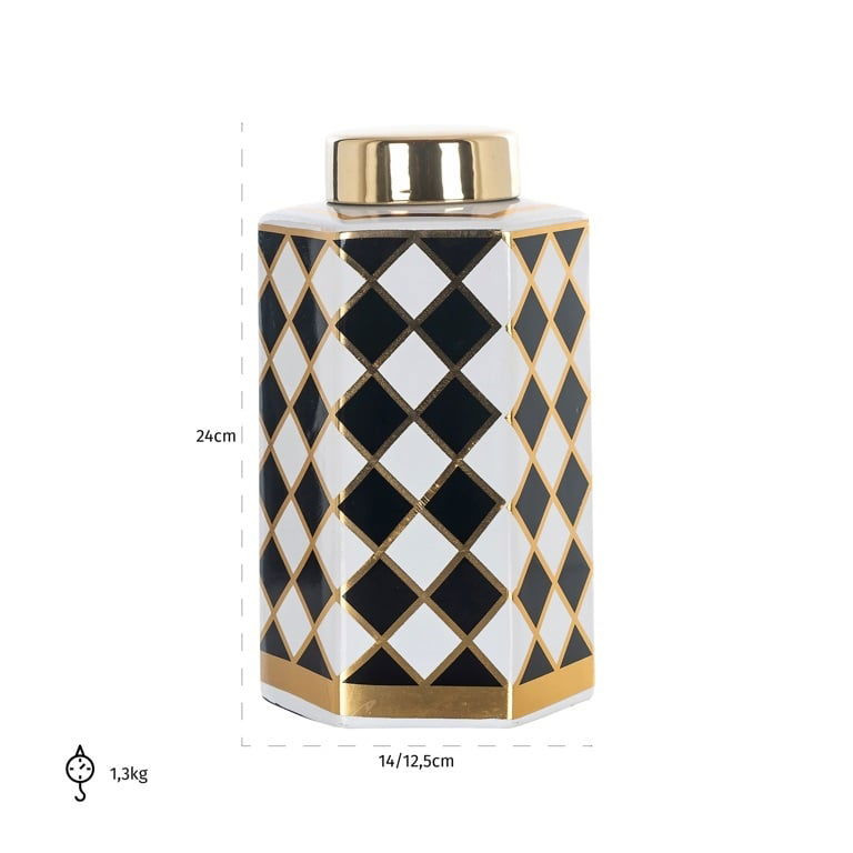 Kerámia kivitelezés fekete-fehér geometrikus mintákkal, aranyszínű elemekkel.