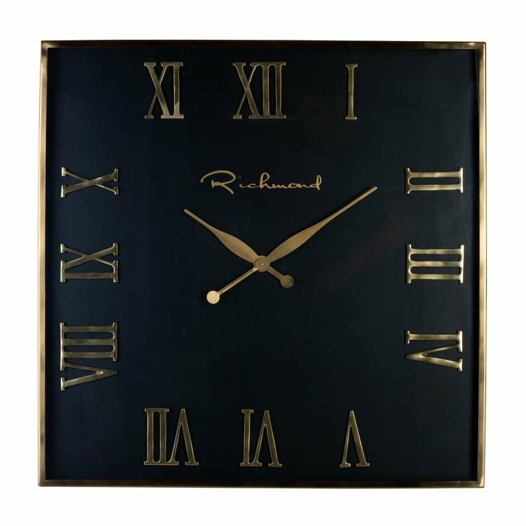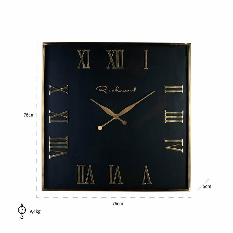 A négyzet alakú számlap fekete színű, arany részletekkel díszített.