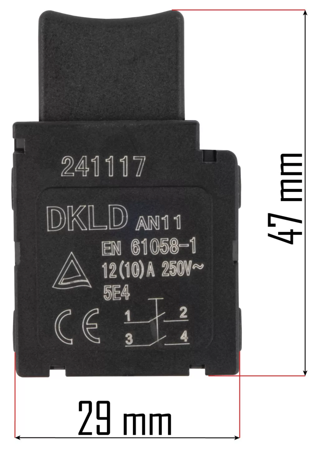 A kapcsoló pillanatkapcsoló (visszarugózó) elven működik, ami alapvető biztonsági funkció a kerti gépeknél: a gomb elengedésekor az áramkör azonnal megszakad, megállítva a motort. A precíz, 47 mm-es magasság és 29 mm-es szélesség garantálja, hogy az alkatrész pontosan illeszkedjen a gyári fogantyúba, elkerülve a lötyögést vagy a beépítési nehézségeket.