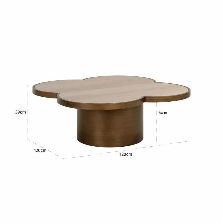 A Richmond Clover dohányzóasztal egyedi, lóhere ihlette kialakításával azonnal a figyelem középpontjába kerül. A travertin kerámia felület és az újrahasznosított fa elemek tökéletes összhangot alkotnak a modern fémelemekkel, így teremtve meg az időtlen elegancia érzetét.