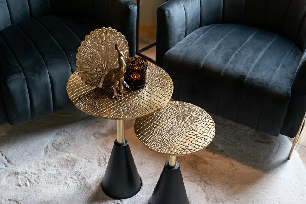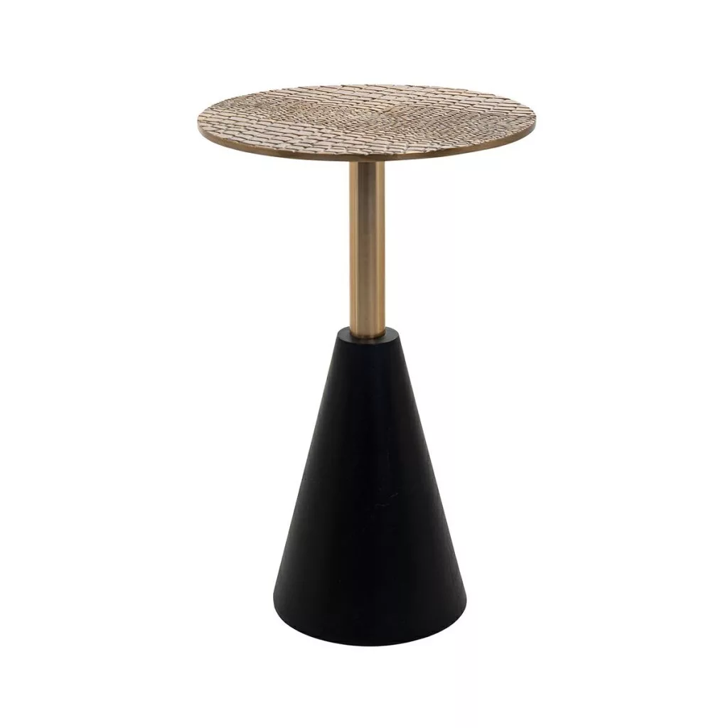 Elegáns Richmond Cobra dohányzóasztal egzotikus mintázatú arany asztallappal és fekete kúpos lábbal. Ez a teljesen alumíniumból készült darab tökéletes választás a modern és luxus enteriőrökhöz.