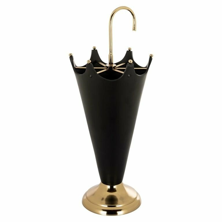 Elegáns, esernyő alakú állvány fekete-arany színkombinációban, amely tökéletes kiegészítője minden modern vagy klasszikus enteriőrnek.