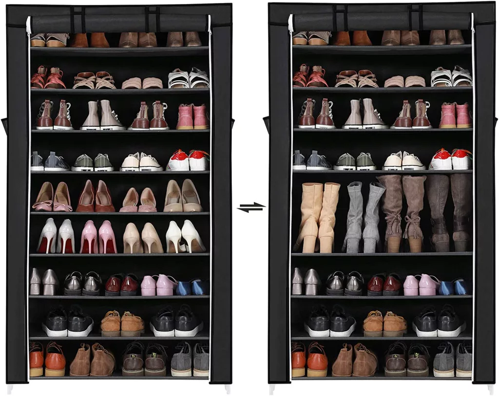 A rugalmas polcrendszer lehetővé teszi a magas szárú csizmák tárolását is, míg az oldalsó zsebek praktikus tárolóhelyet biztosítanak kiegészítők számára. A cipzáras, tépőzáras ajtó könnyű hozzáférést biztosít, miközben védi cipőit a portól.