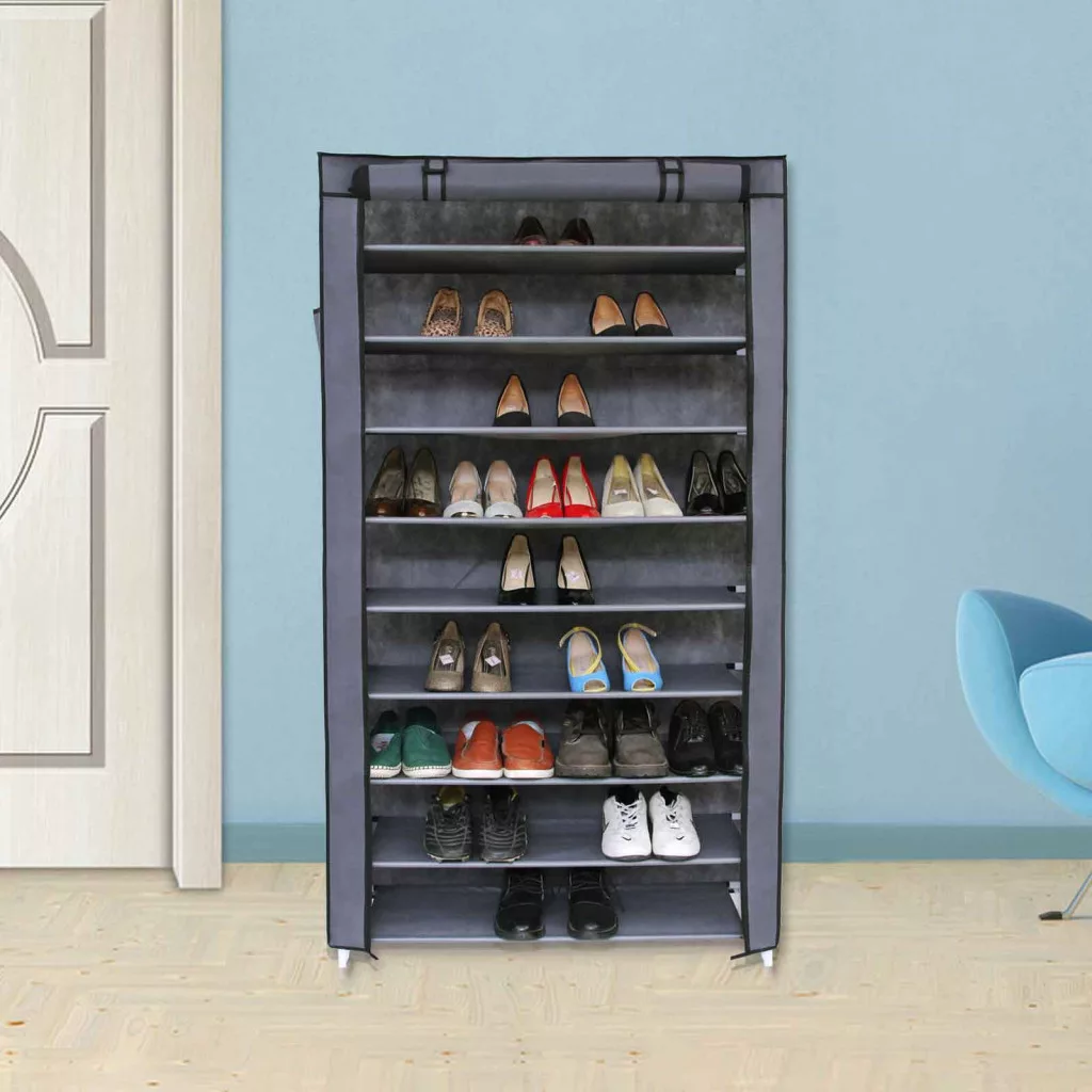 A SONGMICS 10 szintes cipőtároló a tökéletes választás azok számára, akik szeretnék rendszerezni cipőgyűjteményüket és megvédeni azokat a portól, nedvességtől és rovaroktól. A 160 cm magas tároló 10 tágas polcával akár 40 pár cipő befogadására is alkalmas, így ideális megoldás nagyobb családok vagy cipőrajongók számára. A szürke színű porvédő huzat zipzárral és tépőzárral van ellátva, amely könnyű hozzáférést biztosít, miközben megóvja cipőit a külső hatásoktól.