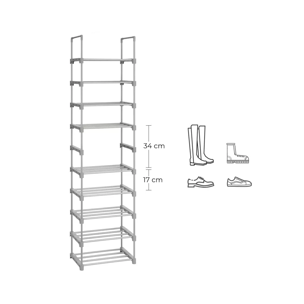 Ez a karcsú, 10 szintes cipőtároló állvány intelligens megoldást kínál a cipők rendszerezett tárolására. A megerősített fémcsövekből készült szerkezet nem csak stabil, de rendkívül sokoldalú is - az egyes polcok eltávolításával magas csizmák és tárolódobozok elhelyezésére is alkalmassá tehető.