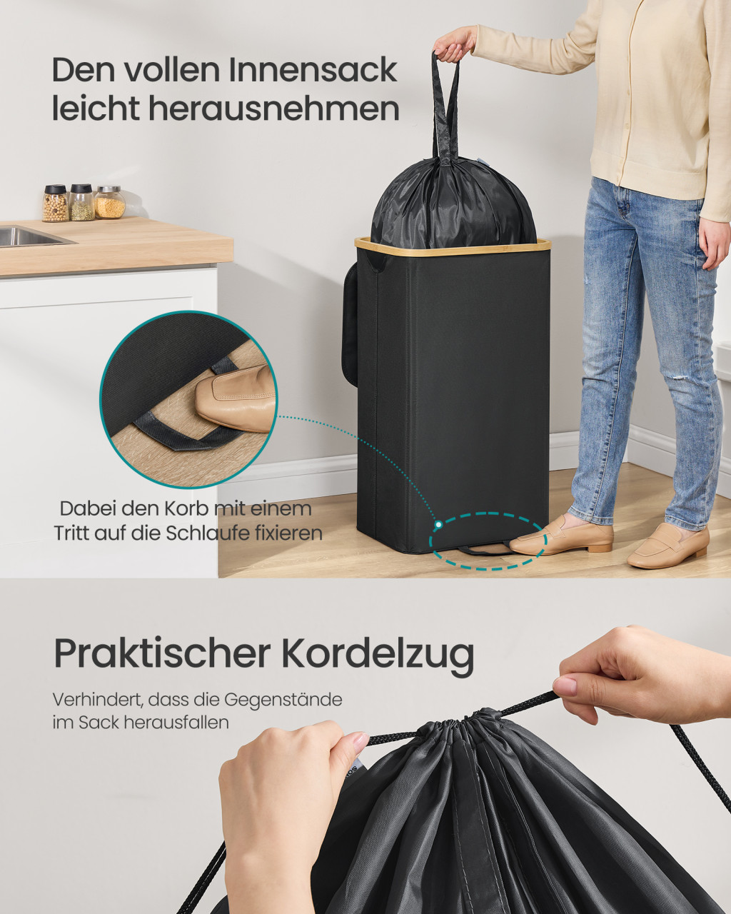 • Higiénikus használat: Az önzáródó bedobónyílás megakadályozza a szagok terjedését, a mosógépben mosható belső zsák pedig könnyen tisztítható