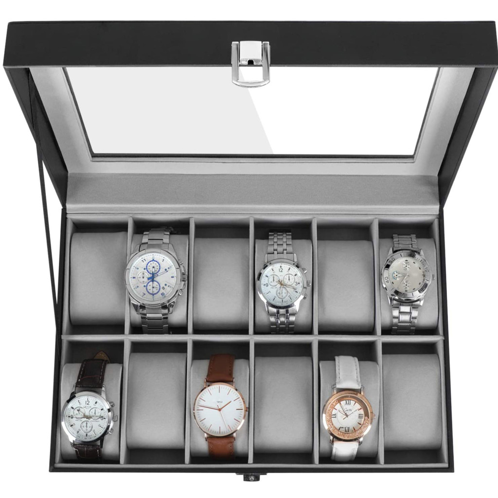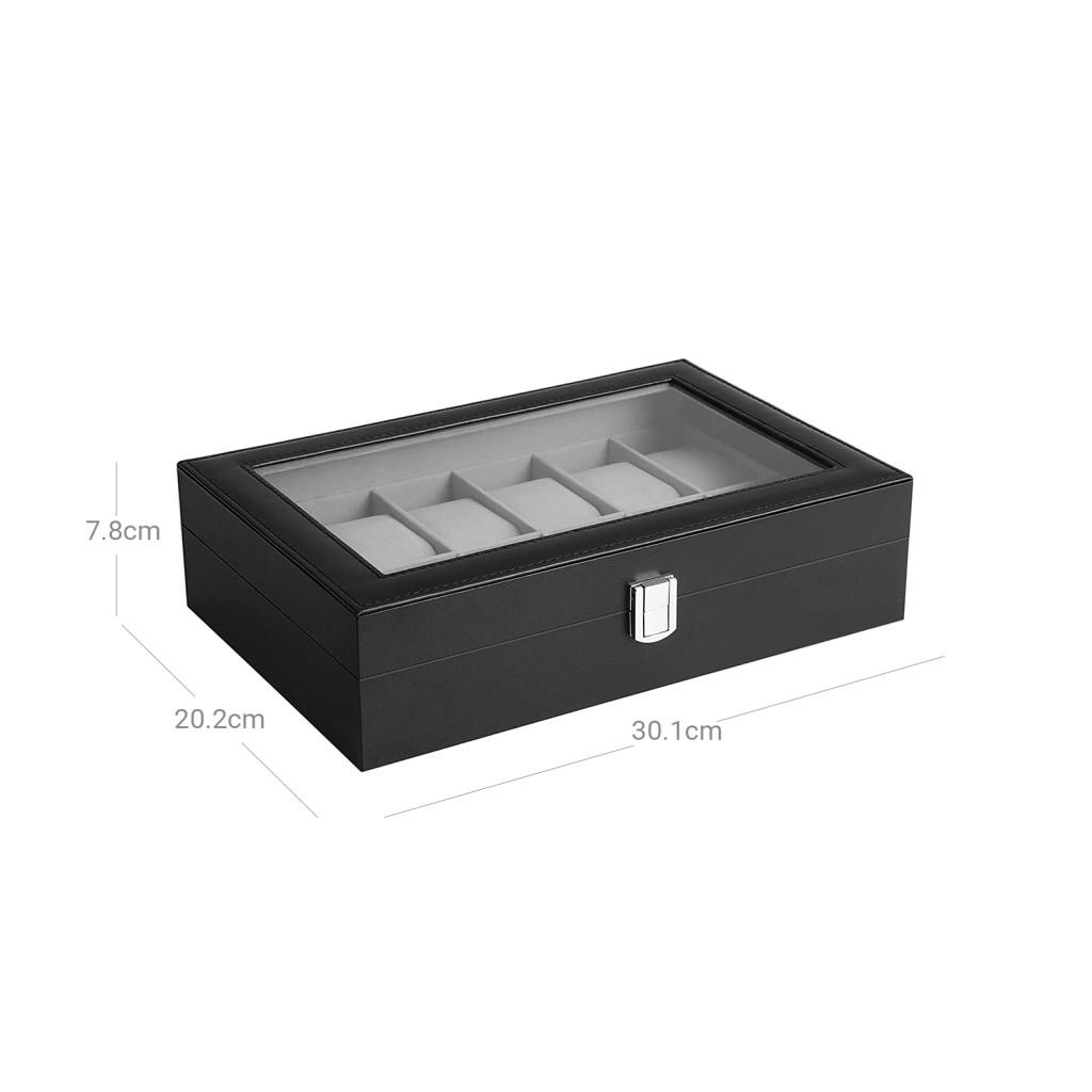 SONGMICS 12 Rekeszes Óratartó Doboz Üvegfedéllel Fekete