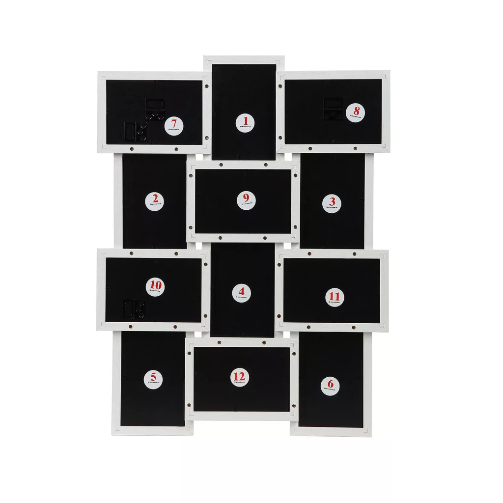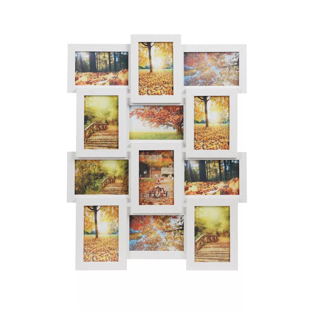 Ez a modern kialakítású képkeret kollázs tökéletes módja annak, hogy kedvenc fényképeit stílusosan jelenítse meg otthonában. A fehér fa mintázatú keret 12 darab 10x15 cm-es fénykép elhelyezésére alkalmas, és környezetbarát MDF anyagból készült.