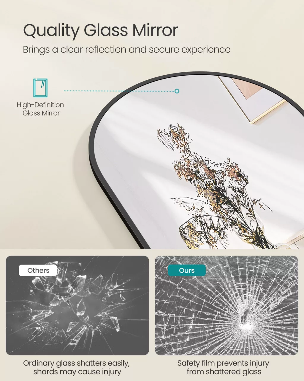 • Azonnali használat: Nincs szükség összeszerelésre – a tükör azonnal használatra kész, könnyű súlya pedig megkönnyíti a mozgatást és elhelyezést