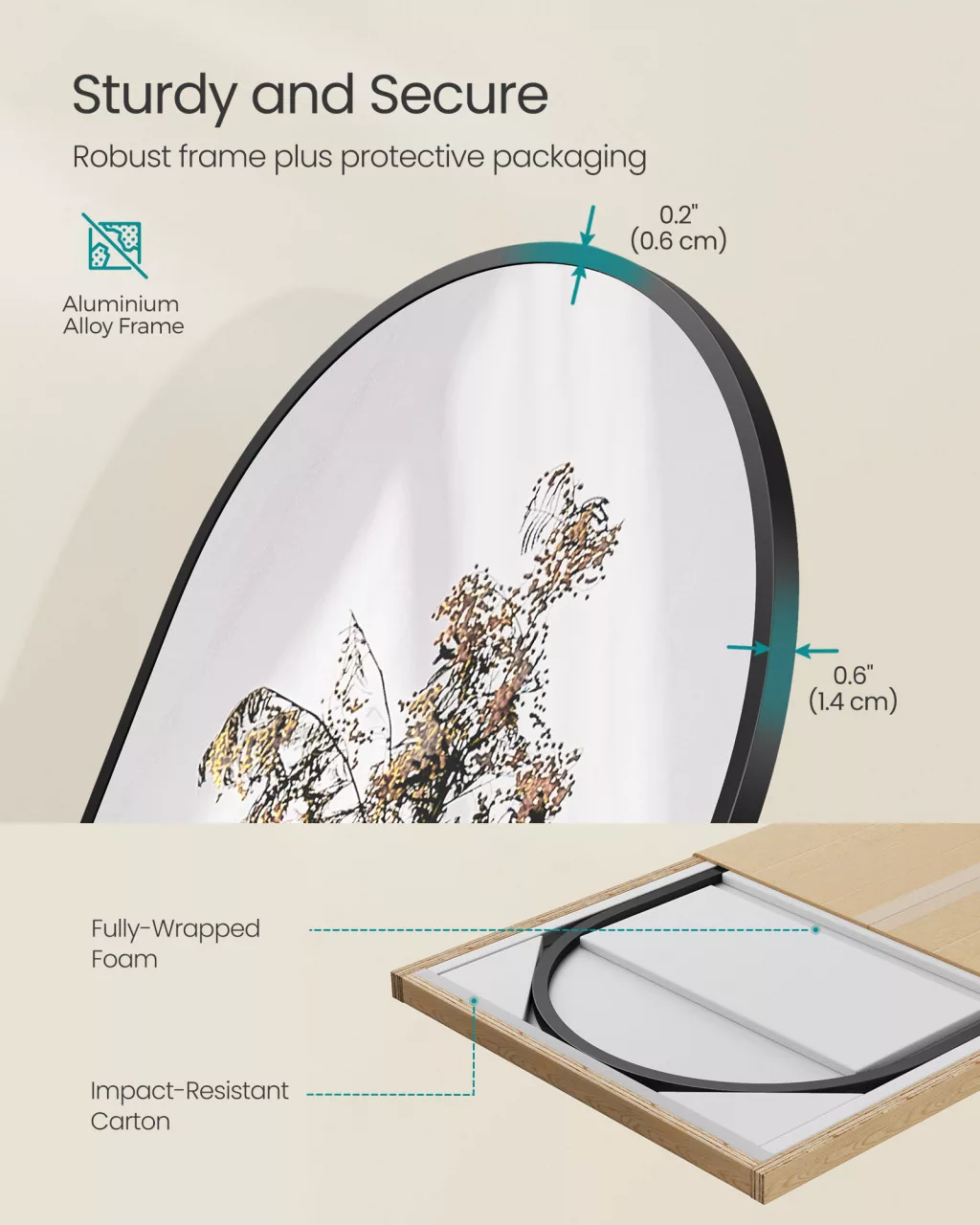 A tükör sokoldalú elhelyezési lehetőségeket kínál: állíthatod a padlóra, támaszthatod a falhoz, vagy akár fel is akaszthatod. A prémium minőségű alumínium ötvözet keret rozsdamentes és tartós, megőrzi fényes felületét hosszú éveken át. Nincs szükség összeszerelésre – egyszerűen csomagold ki, és máris használhatod! Tökéletes választás azok számára, akik értékelik a minőséget, a stílust és a praktikusságot.