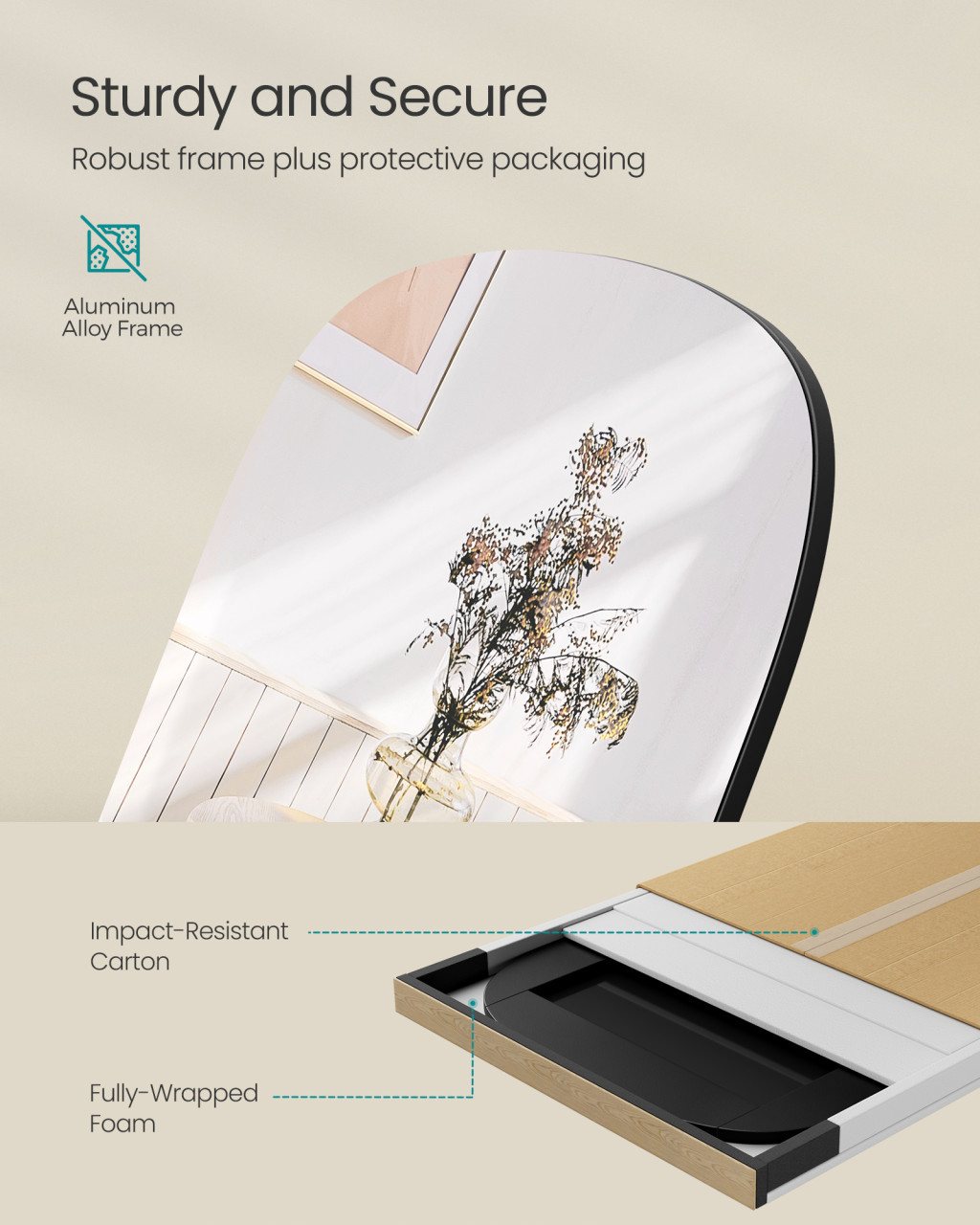 A prémium minőségű alumínium ötvözet keretnek köszönhetően a tükör rozsdamentes és hosszú élettartamú, miközben megőrzi vonzó megjelenését. A termék teljesen összeszerelve érkezik és könnyű, így egyszerűen mozgatható és elhelyezhető bárhol, ahol szüksége van rá. A stabil állvány biztosítja a tükör biztonságos felállítását, így azonnal használatba veheti anélkül, hogy bonyolult szerelési folyamattal kellene bajlódnia.