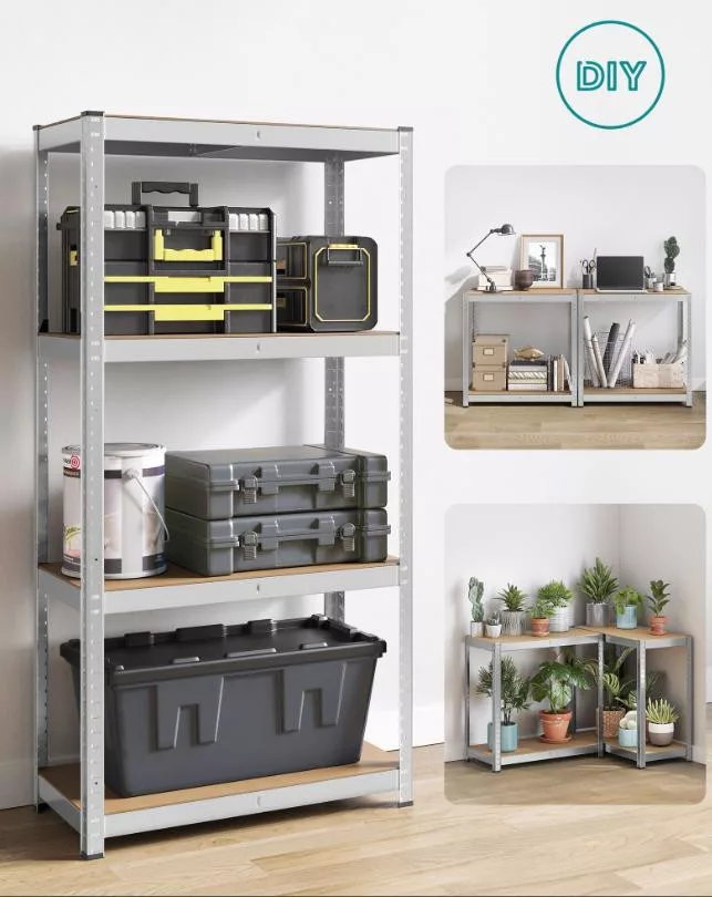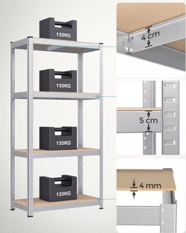 Tartós és rugalmas tárolási megoldás garázsba, műhelybe vagy raktárba. 130 kg-os polconkénti teherbírás, 3 cm-es magasságállítás, csavarozás nélküli szerelés.